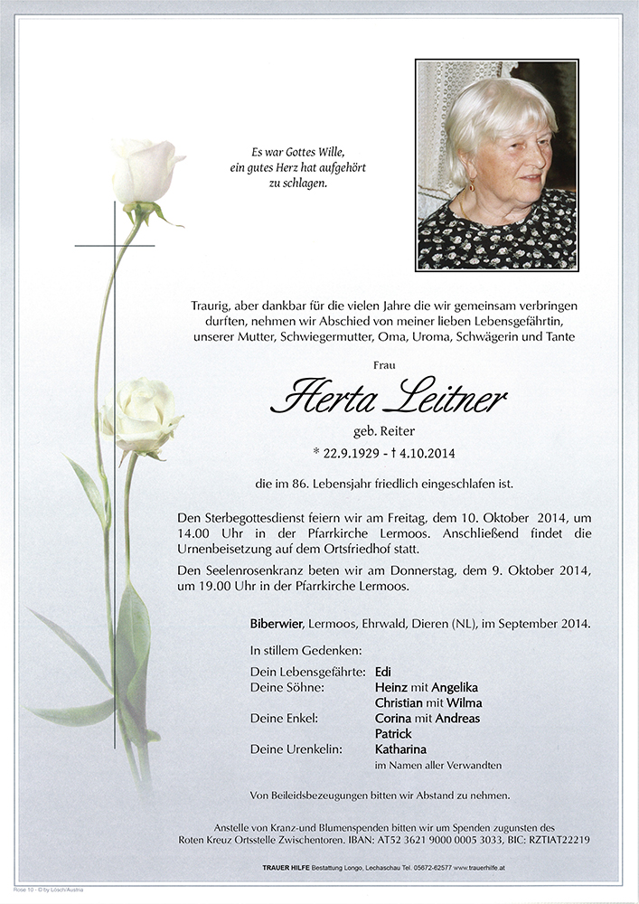 In stiller Anteilnahme am Heimgang eurer lieben Herta