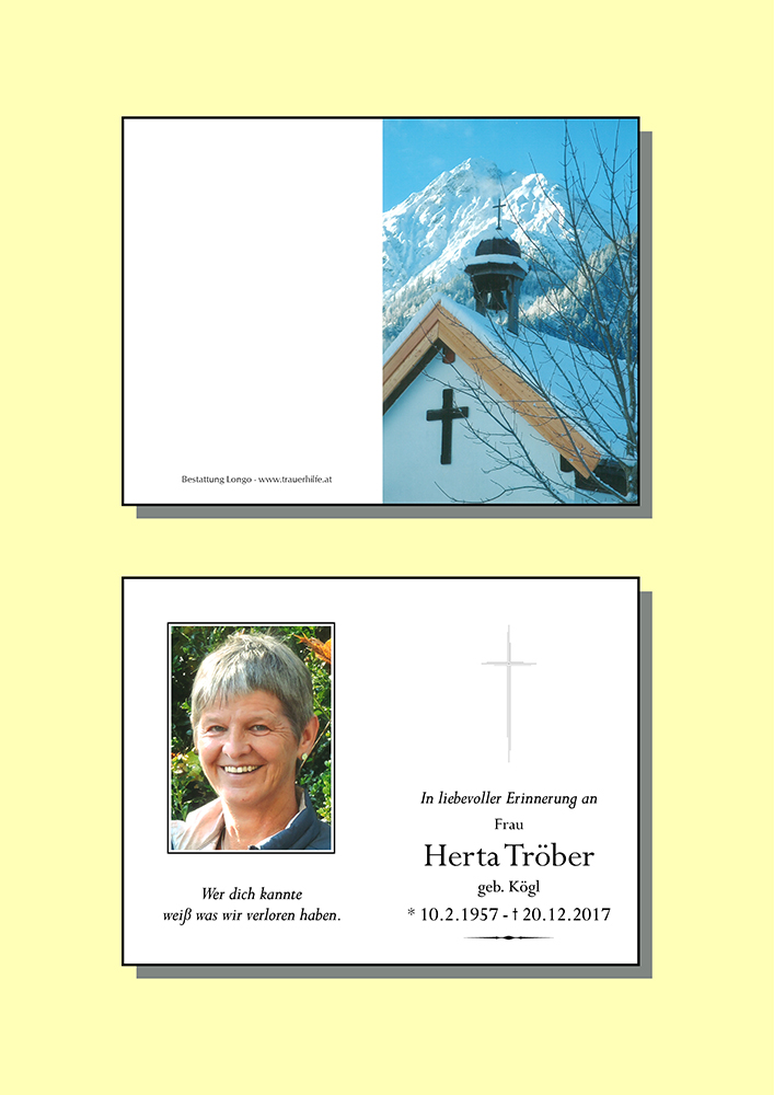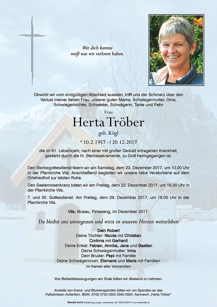Wo Hände das Unbegreifliche nicht fassen können,bleibt einzig die Gewissheit, dass Herta in euren Herzen weiterleben wird."