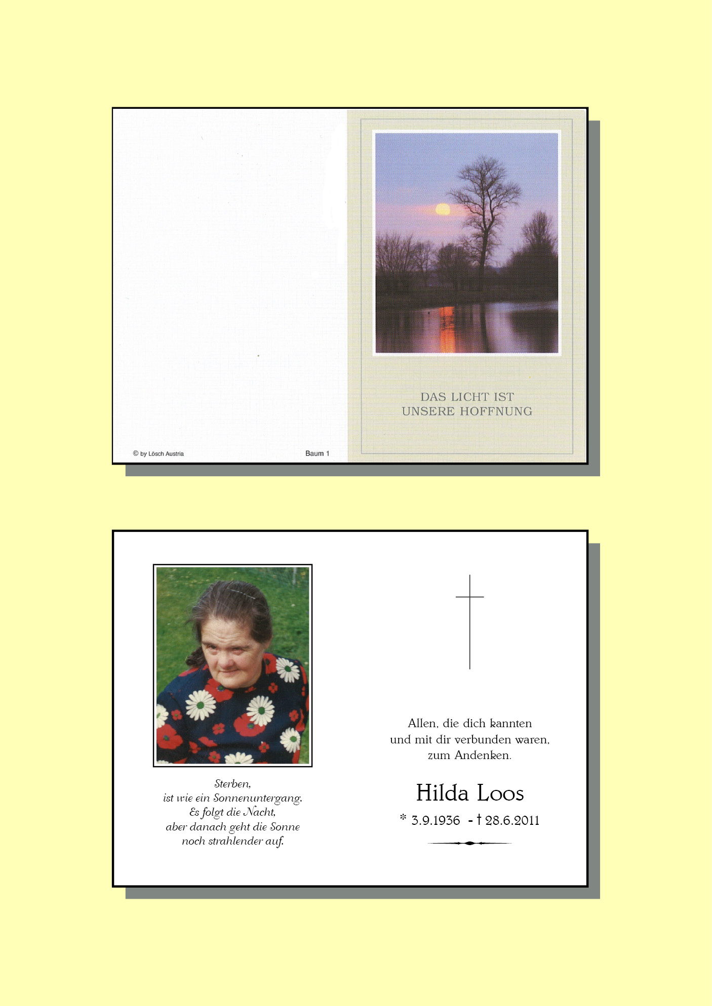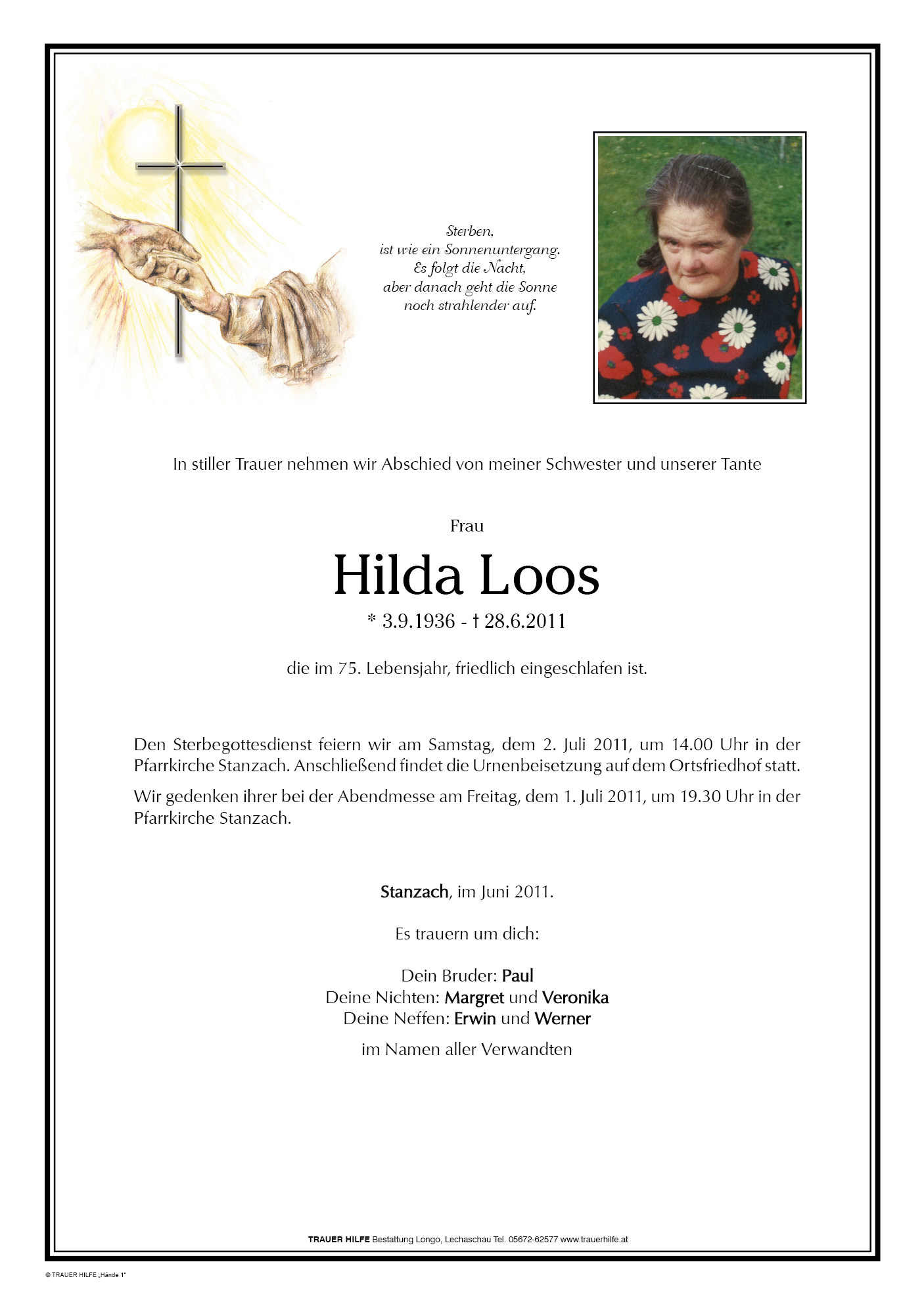 13.12.1901 28.06.2011 Stanzach Hilda Loos Action Parte Sterbebild Gedenkkerzen Kondolenzen Parte Sterbebild Gedenkkerzen Kondolenzen Parte herunterladen Sterbebild herunterladen Gedenkkerzen für Hilda Loos 1 Eintrag Kerze anzünden Fam. Brandhofer Ihre Gedenkkerze fürHilda Loos Ihr Name* Farbe auswählen Ihre Nachricht oder Name* E-Mail-Adresse* Mit dem Klicken auf "Kerze anzünden" erklären Sie sich mit unseren Datenschutzbestimmungen einverstanden. Kondolenzbuch für Hilda Loos 0 Einträge Kondolenz verfassen Ihr Abschiedsgruß an Hilda Loos Ihr Name* E-Mail-Adresse* Ihre Nachricht* Mit dem Klicken auf "Gruß absenden" erklären Sie sich mit unseren Datenschutzbestimmungen einverstanden.