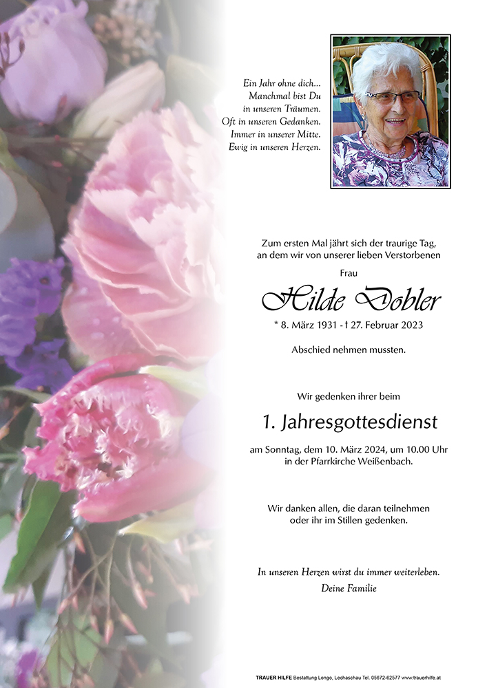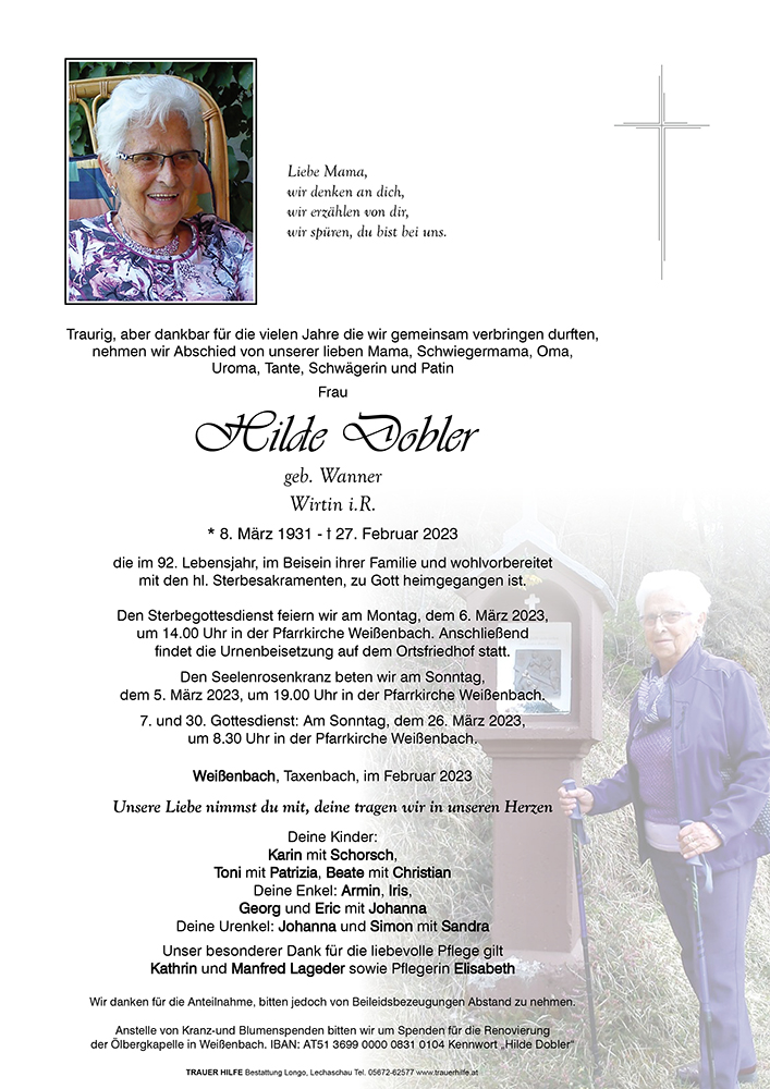 Hilde war Gründungsmitglied der Ortsgruppe Weissenbach des PVÖ. Sie war uns über 43 Jahre eine treue Begleiterin, die wann immer möglich, bei unseren Veranstaltungen dabei war. Sie war mit ihrer Eleganz für viele älteren Menschen ein Vorbild. Wir trauern mit euch um diese ganz besondere Frau. Sie ruhe in Frieden.