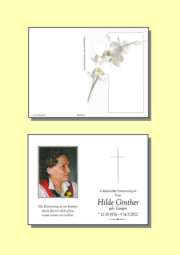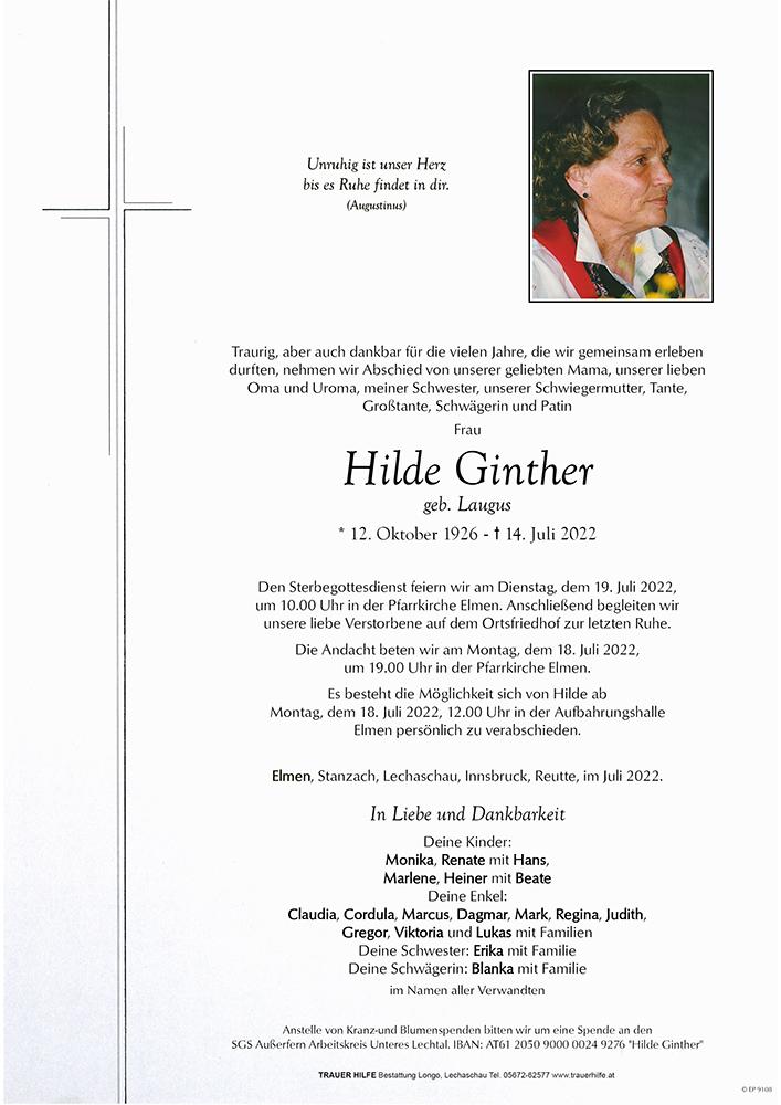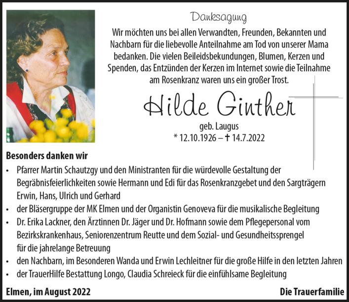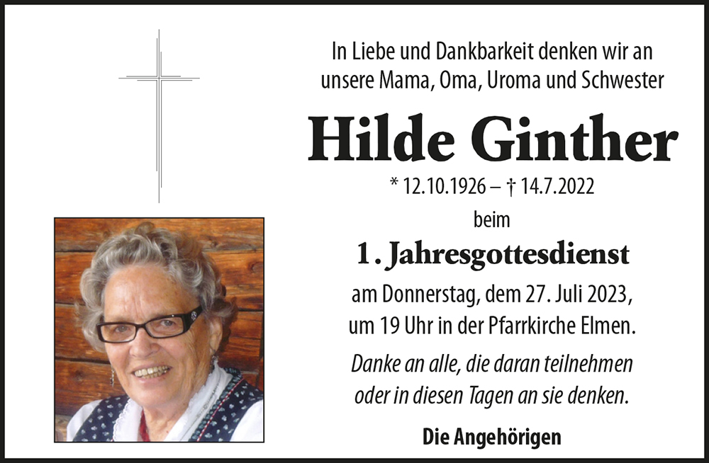 Im Winter 1975/76 wir hatten gerade unseren Start mit unserem Sparmarkt im Hotel Post im Untermarkt, ging eine Dachlawine ab, und begrub das nagelneue Auto von Frau Ginther. Grosses Glück verhinderte eine Katastrophe. So lernte ich Hilde, als Frau mit starken Nerven, einem grossen Optimismus und einem unendlichen Humor kennen. Es entstand daraus eine lebenslange Freundschaft. Liebe Hilde, du wirst vielen Menschen fehlen, aber dort wo du nun bist, wirds durch dich, sicher viel lustiger sein. Danke für so viele Jahre Treue und Freundschaft, aus dem fernen Spanien, Peter und Christine