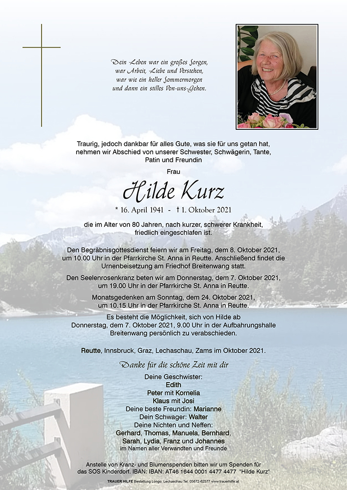 Das Ableben Ihrer Schwester berührt auch uns "NACHBARN", haben wir doch euer Aufwachsen vom Wolfsberg herab betrachten können und Hilde immer als nette Zeitgenossin erlebt. Der Herrgott schenke ihr die ewige Ruhe. Wir fühlen mit Euch.