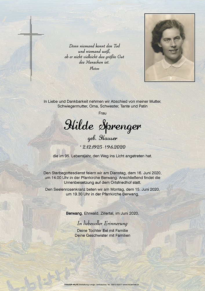 02.12.1925 09.06.2020 Berwang Hilde Sprenger Action Parte Sterbebild Gedenkkerzen Kondolenzen Danksagung Parte Sterbebild Gedenkkerzen Kondolenzen Danksagung Parte herunterladen Sterbebild herunterladen Gedenkkerzen für Hilde Sprenger 38 Einträge Kerze anzünden Fam. Kranzler Ruhe sanft ! EVI u. Peter Wirth mit Familie Waldegger Huber mit Marianne habs schön im Himmel Fam. Peter und Daniela Singer Ruhe sanft ! EVI u. Peter Wirth mit Familie Walter und Anita Falger Familie Singer / Anrauth Fam. Heidi und Karli Koch Anni und Helmut aus Kirchbichl Monja, Alex und Sophia Fam. Willi Berktold Lorenz Maria Eistüberl Cornelia & Jürgen Steinberger mit Kinder Fam. Gerhard Wechner Haus Ehrenberg Wohnbereich 4 Kurt und Susanne Sprenger mit Familie Herta Pallhuber mit Familie Team des SGS Ausserfern Fam. Anton und Gabi Lorenz Rentnergemeinschaft Berwangertal Fam. Wechner Mitteregg Ch. und Th. Reinstadler Andrea, Markus, Marie & Paul Weissmann Roland u. Patricia Krebs, Evelyne Wolf Ruhe in Frieden! Familie Erich Papp A Lichtle aus Reutte Deine Schwester Lisi mit Fam. Margit Weirather, Lechaschau Nicola, Markus & Elena Wolf Dietmar Berktold Renate Praxmair-Perle⭐⭐⭐ Ruhe in Frieden Mario und. Barbara Rief Familie Paschinger Roland Claudia Schreieck TrauerHilfe Bestattung Longo Ihre Gedenkkerze fürHilde Sprenger Ihr Name* Farbe auswählen Ihre Nachricht oder Name* E-Mail-Adresse* Mit dem Klicken auf "Kerze anzünden" erklären Sie sich mit unseren Datenschutzbestimmungen einverstanden. Kondolenzbuch für Hilde Sprenger 1 Eintrag Kondolenz verfassen Wir sind nur Gast auf Erden und wandern ohne Ruh‘ mit mancherlei Beschwerden der ewigen Heimat zu. Ruhe in Frieden 10.06.2020 um 17:30 Uhr Ihr Abschiedsgruß an Hilde Sprenger Ihr Name* E-Mail-Adresse* Ihre Nachricht* Mit dem Klicken auf "Gruß absenden" erklären Sie sich mit unseren Datenschutzbestimmungen einverstanden. Danksagung herunterladen