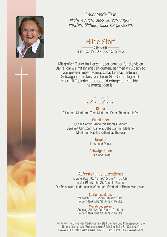 wir möchten auf diesem Wege unsere aufrichtige Anteilnahme am Tode eurer geliebten Hilde zum Ausdruck bringen.