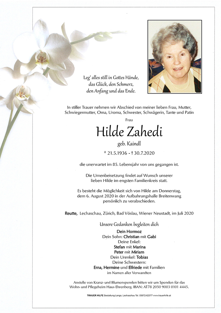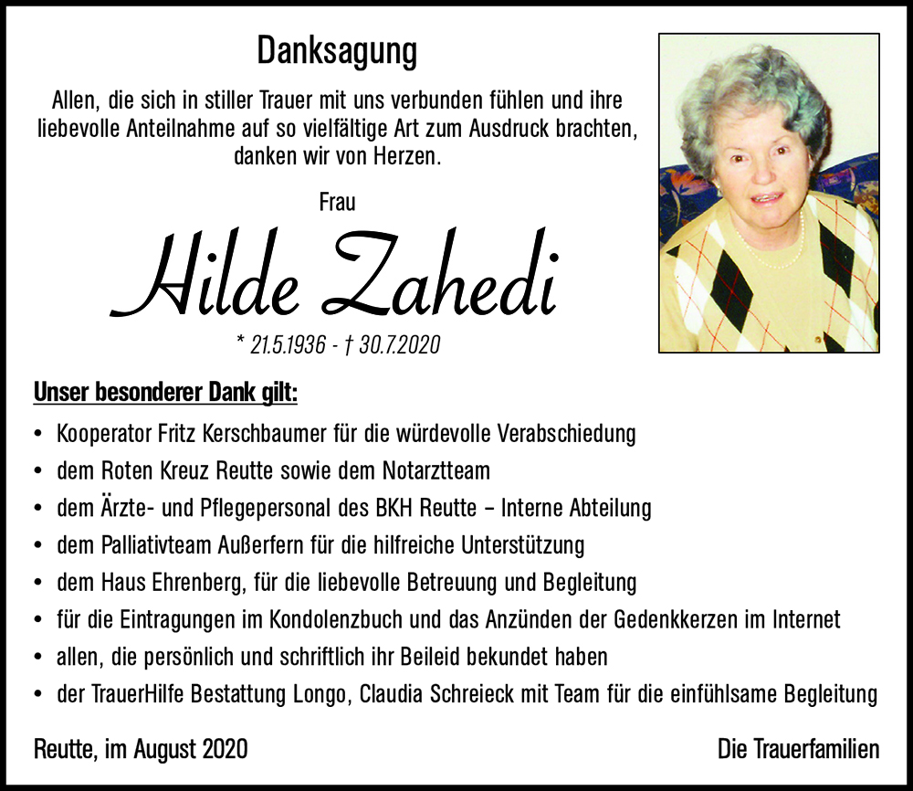21.05.1936 30.07.2020 Reutte Hilde Zahedi Action Parte Sterbebild Gedenkkerzen Kondolenzen Danksagung Parte Sterbebild Gedenkkerzen Kondolenzen Danksagung Parte herunterladen Sterbebild herunterladen Gedenkkerzen für Hilde Zahedi 174 Einträge Kerze anzünden RIP Zum Jahrestag Anna- Maria Tschiderer Zum Jahrestag Anna- Maria Tschiderer Zum Jahrestag Anna- Maria Tschiderer Zum Jahrestag Anna- Maria Tschiderer Zum Jahrestag Anna- Maria Tschiderer Ruth Isenburg Ruhe in Frieden, Ulli & Christian aus Linz Ruhe in Frieden, Ulli & Christian aus Linz Ruhe in Frieden, Ulli & Christian aus Linz Uli Schädler Fam. Silvia Sprenger Raimund Alber Uli Schädler Fam. Silvia Sprenger Norman & Manuela Wankmiller Rosa und Adalbert Lorenz Gitta Schautzgy Bettina und Harald Kiechle mit Familie Ernst Rainer Christine Keller Dort drüben werden wir uns alle wiederseh\'n. Gerlinde Hengg mit Familie Walter + Angelika Lechner Beirer Roland Klaudia Schmid (Haas) Birgit und Johannes Seitz Alois Gratl Fam. Keilhofer Fam. Sibylle Mayrhofer Wolfgang, Herta u. Jasmin Claudia & Ernst Herzinger Johannes Pirchner Petra Hoheneder Fam. Patrizia und Robert Wagner Fam. Dalmonego Berhnard u. Gisela Thomas Frick Herzliches Beileid - Dieter Zingerle Fam. Mantl Bernhard & Gabi Biechl Gerda Walburga & Josef Dürrhammer Josef Walch u. Anita Walch-Lang Firma Peter Lechner mit Familien Fam. Klaus Pirktl Fam. Stefan Beirer Peter Mittermayr Ricarda Wex Fam. Reinhard Gratl Daniela un d Ulrich Weirther Isolde Engelmann Edi Kotz und Marianne Scheiber Herbert u. Monika Schweißgut Fam. Robert & Christine Pacher Florian Christine Strauß mit Familie Margit u. Dietmar Koler Fam. Hämmerle Oskar Peter und Sabrina Fam. Christine Weirather Annemarie & Bruno HAUG Licht und Frieden Rief Horst Harald Kaiser Christl u. Ossi Sprenger Familie Walter Klotz Nadine Specht mit Familie Fam. Bernd und Carola Spitzer Fam. Wagner Lechaschau Anita Schedle Manfred und Margot Koch Reinhold, Edith & Marina Maria und Wolfgang Zangerl Familie Richard und Moni Alber Erika Praxmair ELMAR ISENBURG Walter und Burgi Hammerle Christl u. Karl Prantl Rai ner und Bettina Stoll Bärbel und Walter Hosp Ruth Isenburg Bernhard Primus Helga Hosp Marga Hackl Lisa, Felix & Wolfgang Simader Gretl und Peter Wartusch Winkler Franzi René u. Laura Ursula Leuprecht Elfie Schlux Fam. Gerda u. Fritz Bubendorfer Dietmar und Isabella Wachter Fam. Karin u. Thomas Randl Markus u. Hannelore Hosp Ruhe in Frieden Elisabeth Lipp Manfred Gutmann, Reutte Markus Ebentheuer Doris Baumgartner(Spitzenstätter) Christina und Andreas Wiesenegg Christian & Daria Larcher Monika und Christian Bartel Anna-Maria Tschiderer RIP Fam. Karl & Maria Pellegrini Eberharter Anita und Peter Christiane u. Hansjörg Schimpfössl Johann Fasser Ruhe in Frieden Fam. Kadir Genisol Uli Schädler Marianne Horndacher Fam. Rudi Klotz Familie Leitner Pflach zu Zeit in Pakostane Fam. Peter Senzenberger Alexander & Verena Aufrichtiges Beileid Silvia Häsele Seidel Angelika und Andreas Fam. Andrea und Kurt Hohenrainer Fam. Klaus u. Petra Eberle Fam. Peter & Marianne Schautzgy Gitti Unterkofler Fam. Silvia Sprenger Verena Scheucher Sandra & Florian Fam. Reinhold und Daniela Rud Ein letzer Gruß aus der Nachbarschaft Manuela Sörgel mit Familie Posch Nadine Fam . Günther Haberl Fam. Rudi & Erika Petz Gerhard und Christine Beinstingl Julia u. Ritschi Sonnweber Daniel Pippan Luise und Hans Zitt Werner und Karin Kößler Tobias und Christa Bader Werner und Helga Angerlechner A Liachtl aus\'m Lechtal Hansjörg Silvia und David Hannelore und Martina Schmid Hansjörg u. Anna Maria Fuchs Brigitte Dreier Bernhard und Christine Helfer Eva Sandhacker Bruno Dengg Dominik Heiserer Fam. Wohlgenannt Stephanie Fam. Edi Ammann Herzliches Beileid Dr. Gerhard Auer, Innsbruck Familie Oskar und Marlies Ginther Fam. Franz Grießer Ruhe in Frieden Ida und Paul Kerber Barbara Schweißgut Haus Ehrenberg, WB1 Lukas Schmitt Mario und. Barbara Rief Claudia und Christoph Scheucher Fam. Schweigl Renate Praxmair-Perle Gerda Berger Gerhard u. Annelies Steurer Sven und Anneliese Beinstingl Fam. Paul und Annemarie Kaiser Silke Fellner Claudia&Christian Hohenrainer Gerti Ennemoser Sabine Ennemoser Billa Team Reutte Harald Felsberger Astrid u. Christoph Heiserer Alfred Singer Familie Hohenrainer Claudia Schreieck TrauerHilfe Bestattung Longo Ihre Gedenkkerze fürHilde Zahedi Ihr Name* Farbe auswählen Ihre Nachricht oder Name* E-Mail-Adresse* Mit dem Klicken auf "Kerze anzünden" erklären Sie sich mit unseren Datenschutzbestimmungen einverstanden. Kondolenzbuch für Hilde Zahedi 1 Eintrag Kondolenz verfassen Wir sind nur Gast auf Erden und wandern ohne Ruh‘ mit mancherlei Beschwerden der ewigen Heimat zu. Ruhe in Frieden 01.08.2020 um 10:41 Uhr Ihr Abschiedsgruß an Hilde Zahedi Ihr Name* E-Mail-Adresse* Ihre Nachricht* Mit dem Klicken auf "Gruß absenden" erklären Sie sich mit unseren Datenschutzbestimmungen einverstanden. Danksagung herunterladen