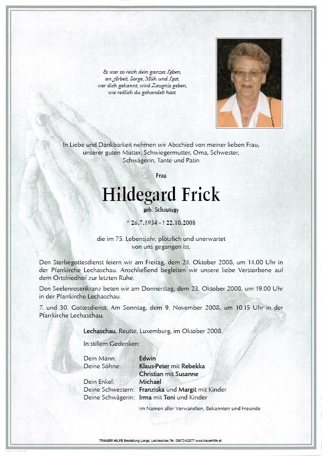 13.12.1901 22.10.2008 Lechaschau Hildegard Frick Action Parte Gedenkkerzen Kondolenzen Parte Gedenkkerzen Kondolenzen Parte herunterladen Gedenkkerzen für Hildegard Frick 2 Einträge Kerze anzünden Ruhe in Frieden ?️ In Erinnerung Ihre Gedenkkerze fürHildegard Frick Ihr Name* Farbe auswählen Ihre Nachricht oder Name* E-Mail-Adresse* Mit dem Klicken auf "Kerze anzünden" erklären Sie sich mit unseren Datenschutzbestimmungen einverstanden. Kondolenzbuch für Hildegard Frick 0 Einträge Kondolenz verfassen Ihr Abschiedsgruß an Hildegard Frick Ihr Name* E-Mail-Adresse* Ihre Nachricht* Mit dem Klicken auf "Gruß absenden" erklären Sie sich mit unseren Datenschutzbestimmungen einverstanden.