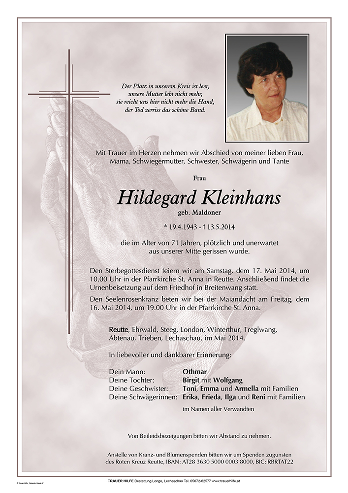 Liebe Birgit, lieber Wolfgang, lb. Herr Kleinhans und sg. Trauerfamilie !