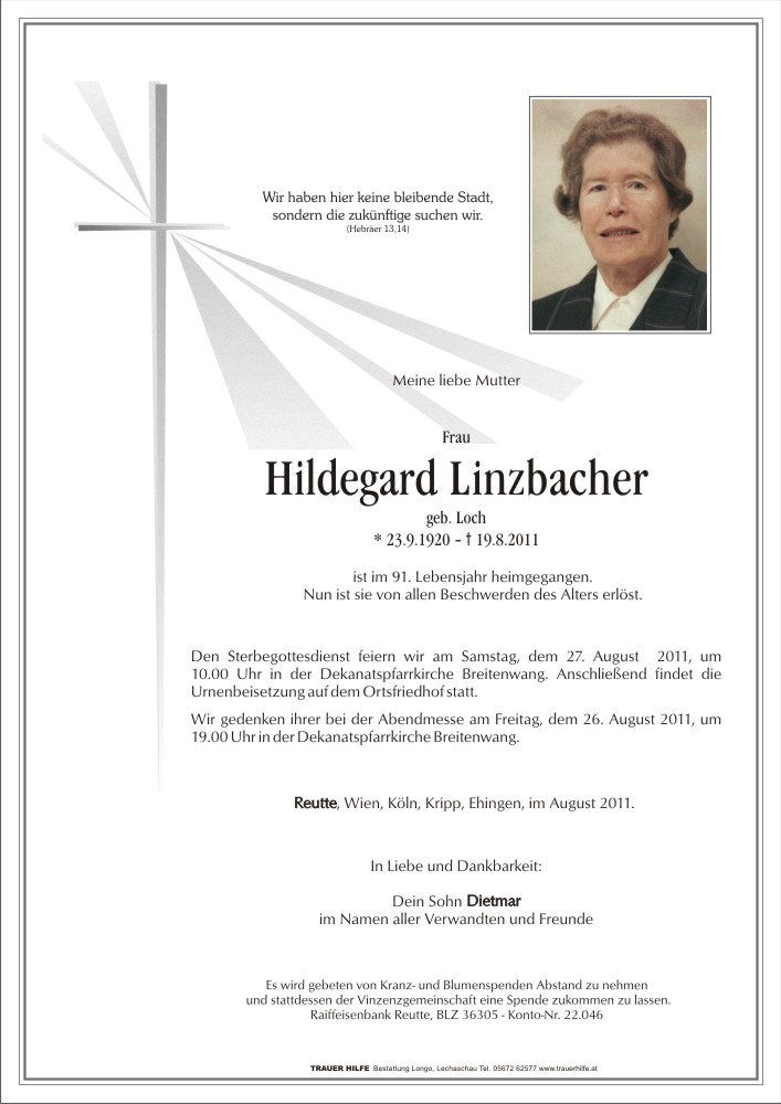 13.12.1901 19.08.2011 Reutte Hildegard Linzbacher Action Parte Sterbebild Gedenkkerzen Kondolenzen Parte Sterbebild Gedenkkerzen Kondolenzen Parte herunterladen Sterbebild herunterladen Gedenkkerzen für Hildegard Linzbacher 4 Einträge Kerze anzünden Susanna Sammt Dietmar Linzbacher Susanna Sammt Susi Schwarzenbacher Ihre Gedenkkerze fürHildegard Linzbacher Ihr Name* Farbe auswählen Ihre Nachricht oder Name* E-Mail-Adresse* Mit dem Klicken auf "Kerze anzünden" erklären Sie sich mit unseren Datenschutzbestimmungen einverstanden. Kondolenzbuch für Hildegard Linzbacher 0 Einträge Kondolenz verfassen Ihr Abschiedsgruß an Hildegard Linzbacher Ihr Name* E-Mail-Adresse* Ihre Nachricht* Mit dem Klicken auf "Gruß absenden" erklären Sie sich mit unseren Datenschutzbestimmungen einverstanden.