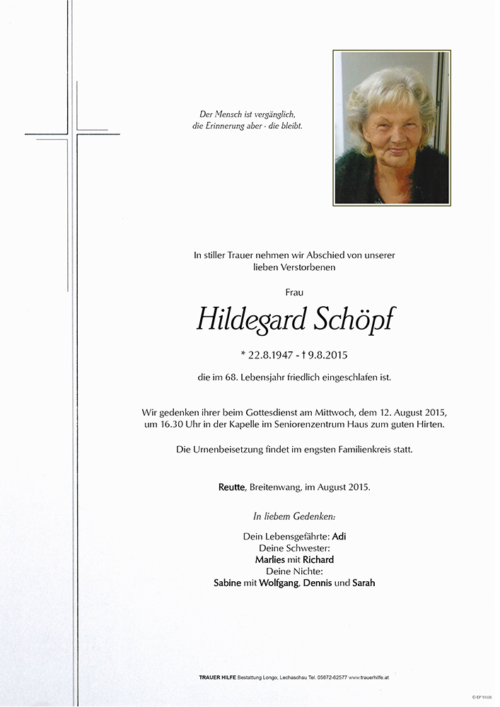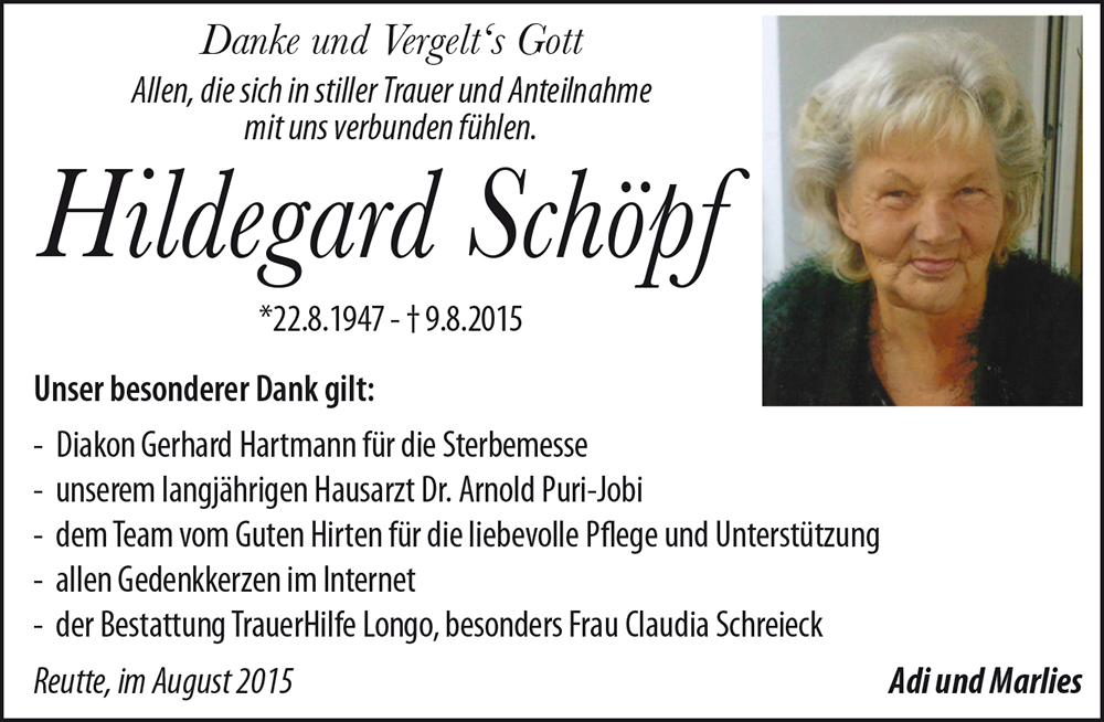 22.08.1947 09.08.2015 Reutte Hildegard Schöpf Action Parte Gedenkkerzen Kondolenzen Danksagung Parte Gedenkkerzen Kondolenzen Danksagung Parte herunterladen Gedenkkerzen für Hildegard Schöpf 83 Einträge Kerze anzünden Licht und Frieden Licht und Frieden ein herzliches Gedenken ein herzliches Gedenken Peter Longo und Söhne Ruhe in Frieden Ramona Bernhard u. Monika Hosp Ruhe in Frieden in stillem Gedenken Hermann Breithuber mit Fam. Fam. Robert u. Patrizia Wagner Fam. Ingrid u. Josef Schratz Rosl Leuprecht Marga Hackl Erika Heiß Johanna Lettenbichler Petschnig Elisabeth Gerlinde Hengg mit Familie Fam. Kößler Werner u. Karin Ruhe in Frieden Bruno u. Margret Fam. Doris Daurer Ruhe in Frieden Wörz Ingrid und Reini Dany Edith und Franz Köck Marlene Felicitas Moll Erika & Gerold Grutsch Ulrike Jäger Familie Regauer Rikki, Manuela u Günter Frischmann Irma & Walter Klaus u. Hannelore Witting Elmar Beirer Fam. Petra Wiesneth/Paulweber Fam. Sigrid u Christian Angerer kerle josefine Sarah Friedle Gloria und Erich Illmer Keller Christine Frieda u. Dr. Arnulf Mair Sax Gerti Rita Paulweber Beate Wiesenegg Eugen Winkler sen. Wendlinger Helene und Fritz Irmgard und Erich beirer Andreas Melekusch Brigitte Illmer Maria Beyrer Herbert & Michaela Suitner Claudia und Christoph Paul Barbist m. Familie Maria & Sonja Wolfgang Hosp Lechaschau Fam. Fritz Melekusch Lotte und Helmut Wagner Anja und Günter mit Kinder Ruhe in Frieden, Gretl Böhm Wolf Helga Marlene Broll Kurt u. Petra Schweiger R. I. P. Dieter Zingerle Fam. Judith Schmitt Maldoner Hubert Kirsten Renate Kuen Heidi Sörgel Margarete u. Emmerich Lutz Gerti Ennemoser Fam. Werner & Margreth Rauth Annemarie Gerber RudigierJusti Rosmarie Susi Leuprecht Ruhe in Frieden! Helga Gundolf Fam. Reinstadler Elfie Schlux Fam. Dagi Kofler Günther und Liselotte Longo Claudia Schreieck TrauerHilfe Bestattung Longo Ihre Gedenkkerze fürHildegard Schöpf Ihr Name* Farbe auswählen Ihre Nachricht oder Name* E-Mail-Adresse* Mit dem Klicken auf "Kerze anzünden" erklären Sie sich mit unseren Datenschutzbestimmungen einverstanden. Kondolenzbuch für Hildegard Schöpf 0 Einträge Kondolenz verfassen Ihr Abschiedsgruß an Hildegard Schöpf Ihr Name* E-Mail-Adresse* Ihre Nachricht* Mit dem Klicken auf "Gruß absenden" erklären Sie sich mit unseren Datenschutzbestimmungen einverstanden. Danksagung herunterladen
