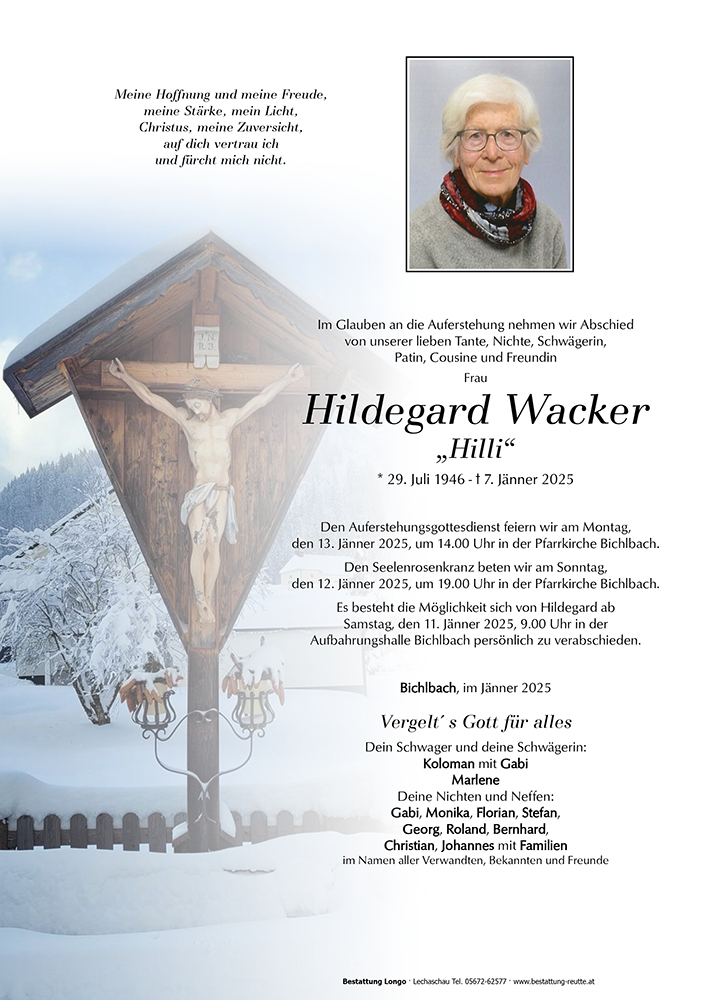 Ich möchte euch auf diesem Wege mein aufrichtiges Beileid entbieten. Es ist schon sehr lange her dass eure liebe Hildegard meine Handarbeitslehrerin an der VS Ehrwald war, aber dennoch erinnere ich mich gerne an ihre ruhige und feine Art zurück. Mögen auch eure schönen Erinnerungen euch in der schweren Zeit der Trauer und des Loslassens Kraft und Trost spenden.