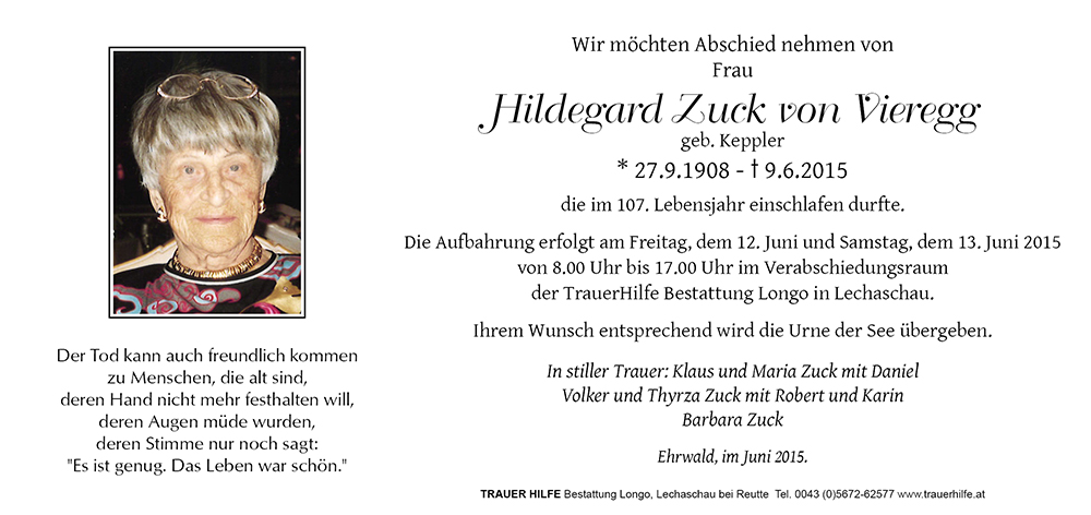 Kondolenzbuch für Hildegard Zuck von Vieregg