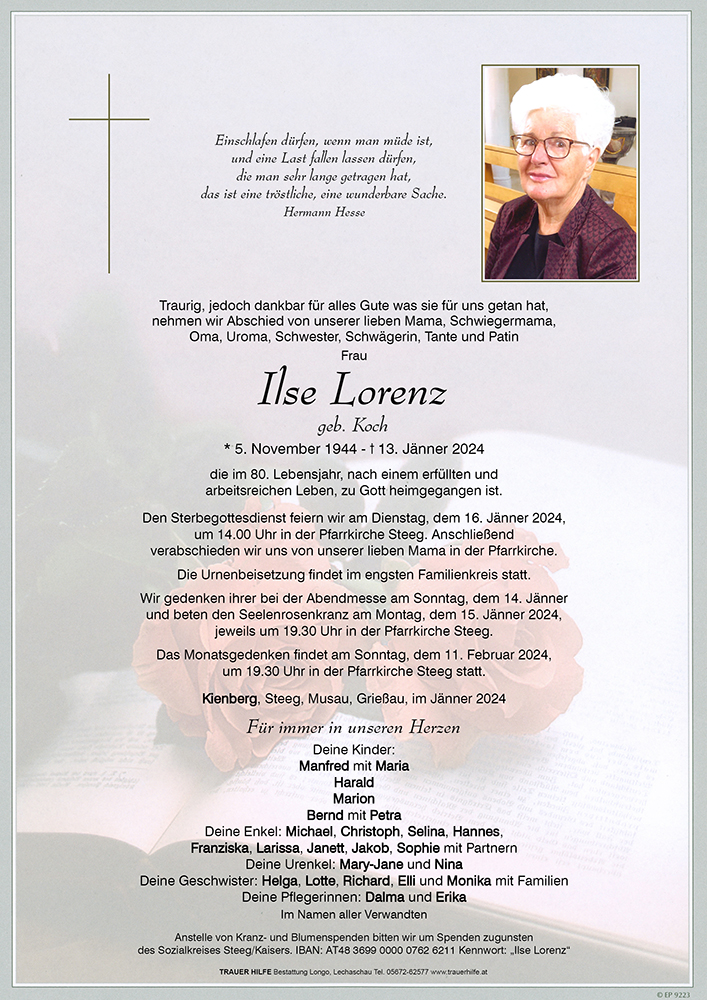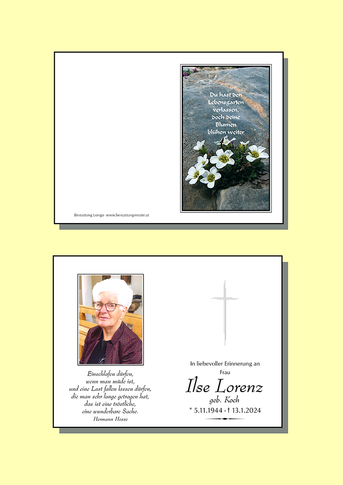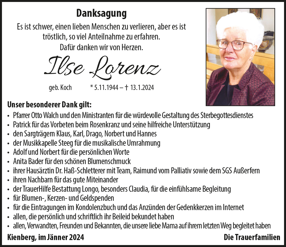 Und so wirst du uns, liebe Ilse, als herzensguter Mensch, Wirtin aus Leidenschaft, freundliche, hilfsbereite und fürsorgliche Nachbarin, die auch stets um das Wohl anderer besorgt und bemüht war, in liebevoller und dankbarer Erinnerung bleiben.
