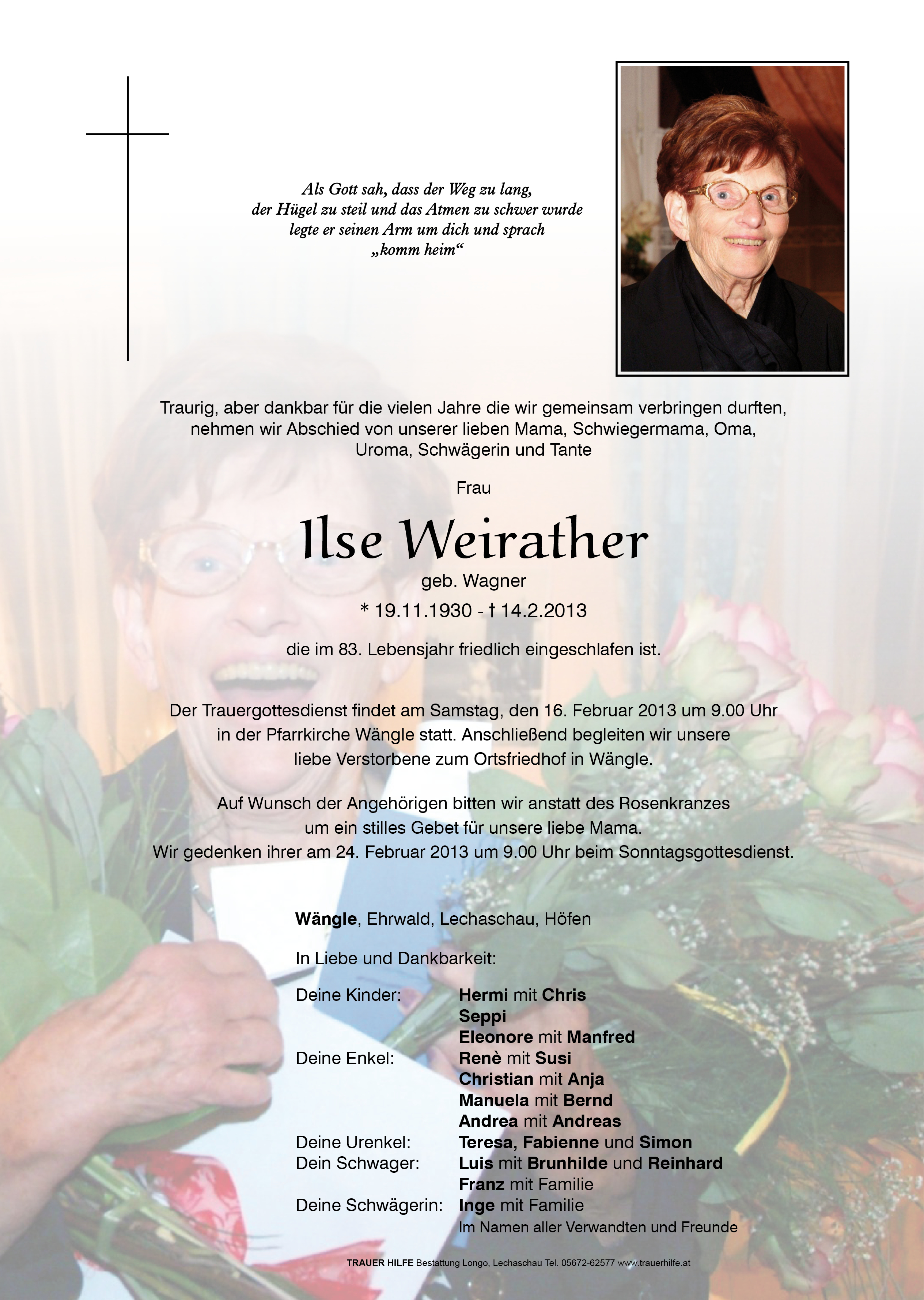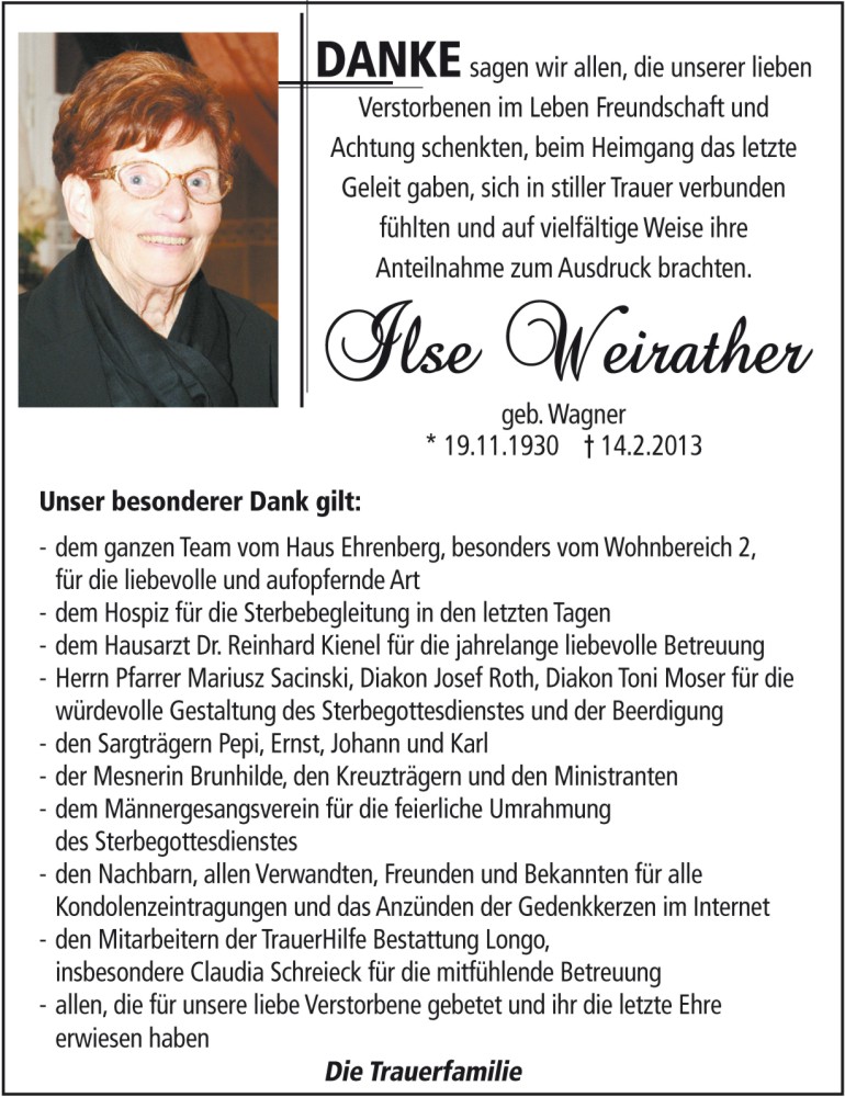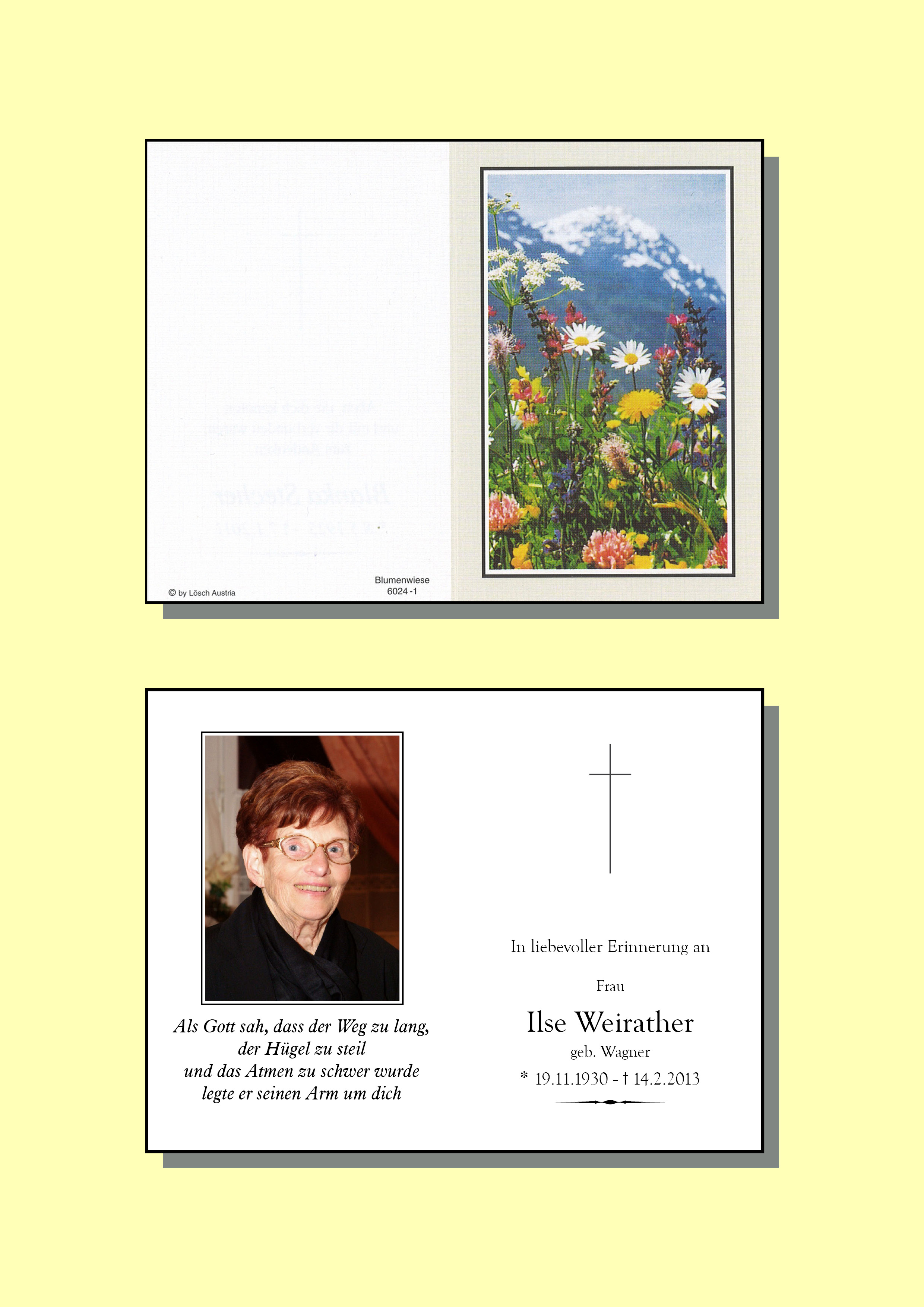 Liebe Hermi, Seppi und Lolli mit Familien, aufrichtige Anteilnahme entbieten Doris und Thomas.