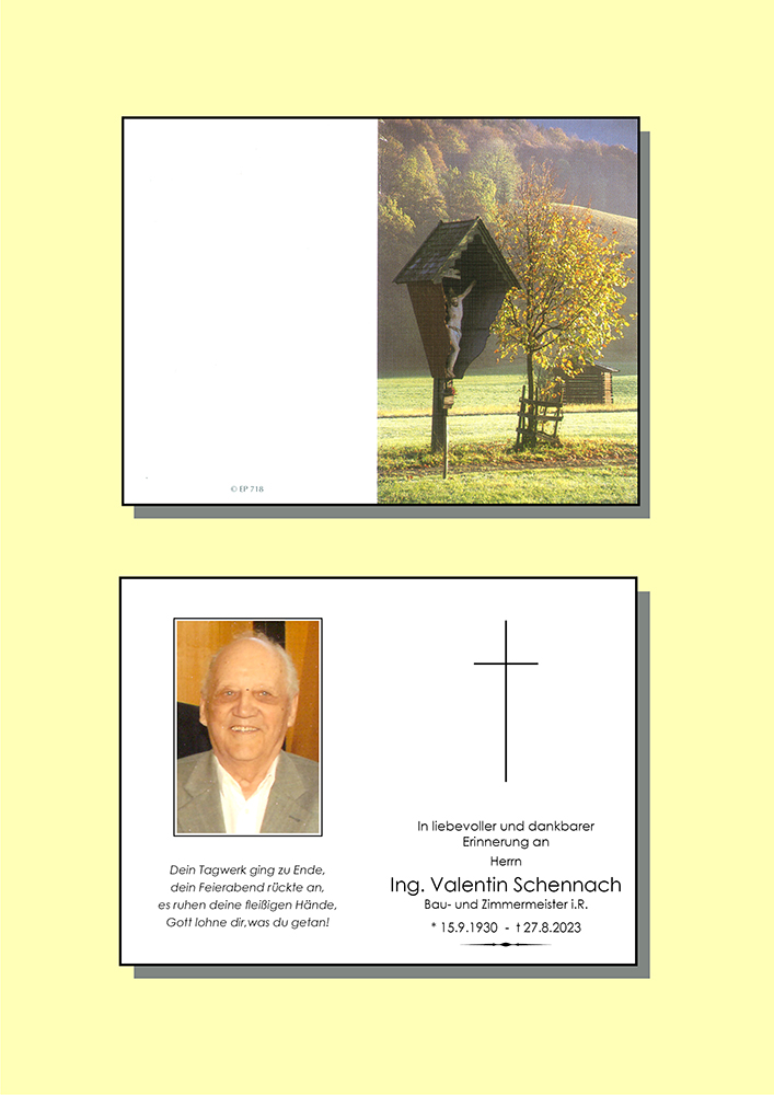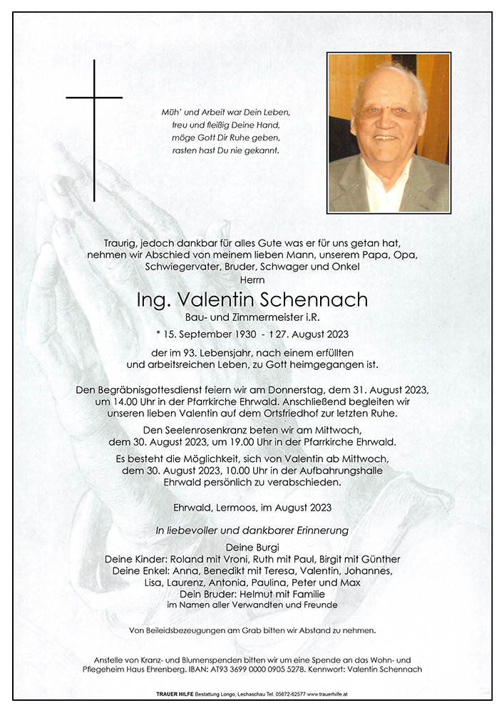 Nach einem arbeitsreichen erfüllten Leben, hat nun der Liebe Gott Valentin erlöst und er durfte seine letzte Reise antreten. Wir werden ihn in lieber Erinnerung behalten. In Gedanken sind wir bei euch Gerlinde und Hansi