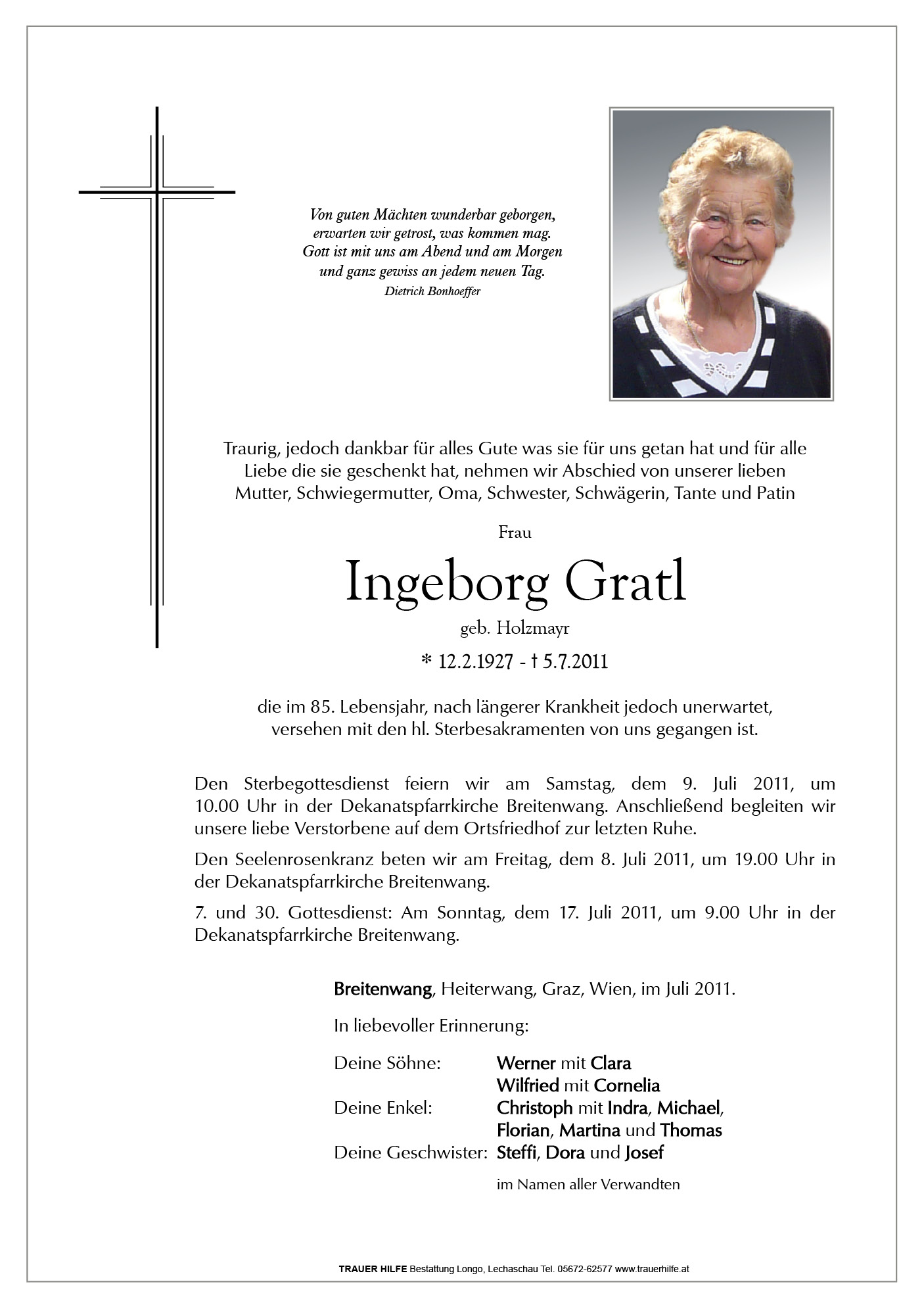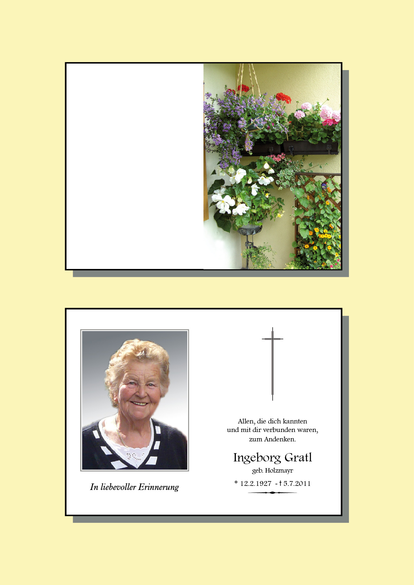 13.12.1901 05.07.2011 Breitenwang Ingeborg Gratl Action Parte Sterbebild Gedenkkerzen Kondolenzen Parte Sterbebild Gedenkkerzen Kondolenzen Parte herunterladen Sterbebild herunterladen Gedenkkerzen für Ingeborg Gratl 1 Eintrag Kerze anzünden Renate Praxmair Ihre Gedenkkerze fürIngeborg Gratl Ihr Name* Farbe auswählen Ihre Nachricht oder Name* E-Mail-Adresse* Mit dem Klicken auf "Kerze anzünden" erklären Sie sich mit unseren Datenschutzbestimmungen einverstanden. Kondolenzbuch für Ingeborg Gratl 0 Einträge Kondolenz verfassen Ihr Abschiedsgruß an Ingeborg Gratl Ihr Name* E-Mail-Adresse* Ihre Nachricht* Mit dem Klicken auf "Gruß absenden" erklären Sie sich mit unseren Datenschutzbestimmungen einverstanden.
