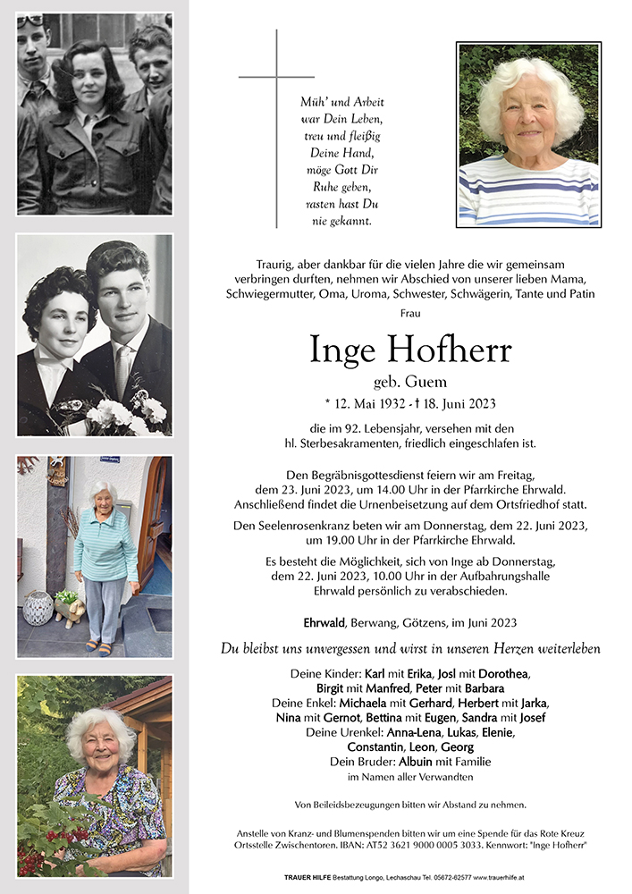 Wir möchten euch auf diesem Wege unser aufrichtiges Beileid entbieten. Mögen die schönen Erinnerungen euch in der schweren Zeit der Trauer Trost spenden. Wir werden Inge auf jeden Fall in lieber Erinnerung behalten.