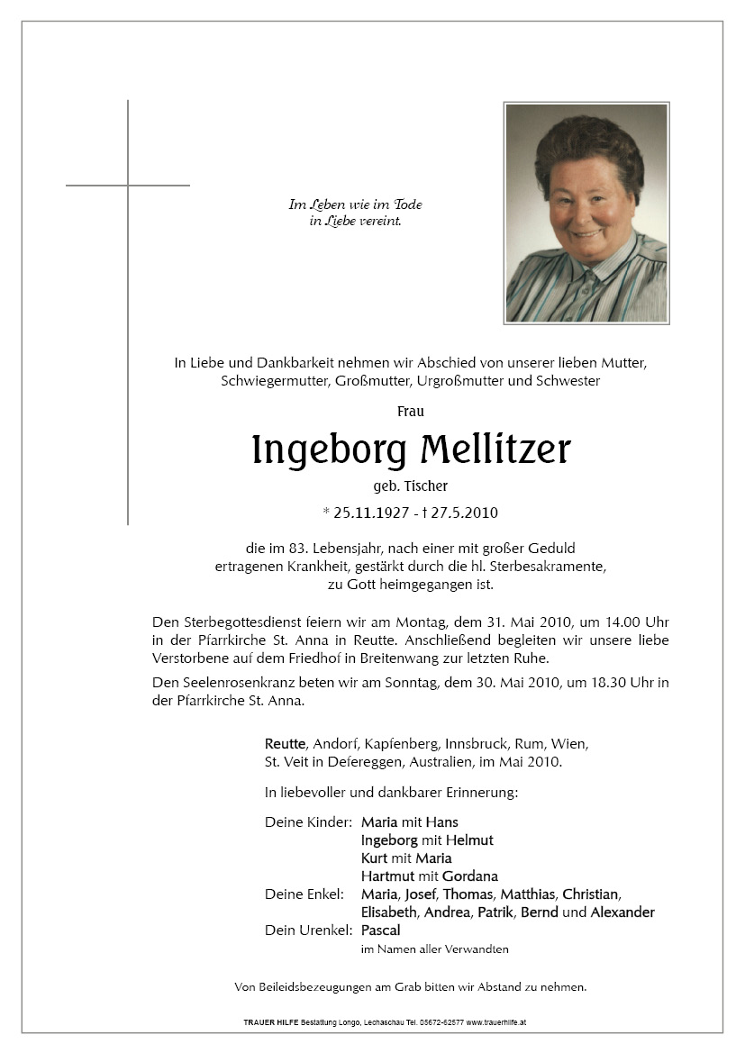 13.12.1901 27.05.2010 Reutte Ingeborg Mellitzer Action Parte Sterbebild Gedenkkerzen Kondolenzen Danksagung Parte Sterbebild Gedenkkerzen Kondolenzen Danksagung Parte herunterladen Sterbebild herunterladen Gedenkkerzen für Ingeborg Mellitzer 0 Einträge Kerze anzünden Ihre Gedenkkerze fürIngeborg Mellitzer Ihr Name* Farbe auswählen Ihre Nachricht oder Name* E-Mail-Adresse* Mit dem Klicken auf "Kerze anzünden" erklären Sie sich mit unseren Datenschutzbestimmungen einverstanden. Kondolenzbuch für Ingeborg Mellitzer 0 Einträge Kondolenz verfassen Ihr Abschiedsgruß an Ingeborg Mellitzer Ihr Name* E-Mail-Adresse* Ihre Nachricht* Mit dem Klicken auf "Gruß absenden" erklären Sie sich mit unseren Datenschutzbestimmungen einverstanden. Danksagung herunterladen