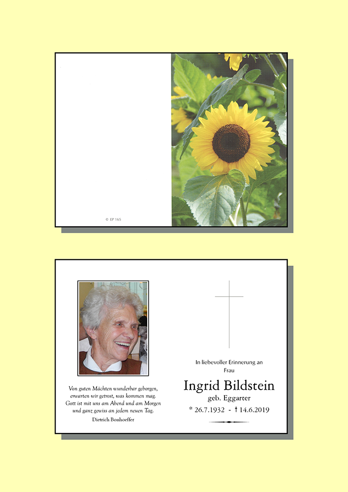 Liebe Trauerfamilie Bildstein - wir moechten Ihnen unsere aufrichtige Anteilnahme entbieten. Es ist uns eine Ehre, Ingrid gekannt zu haben. Silvia und Egon Okorn Egon und Silvia Okorn 16.06.2019 um 18:19 Uhr