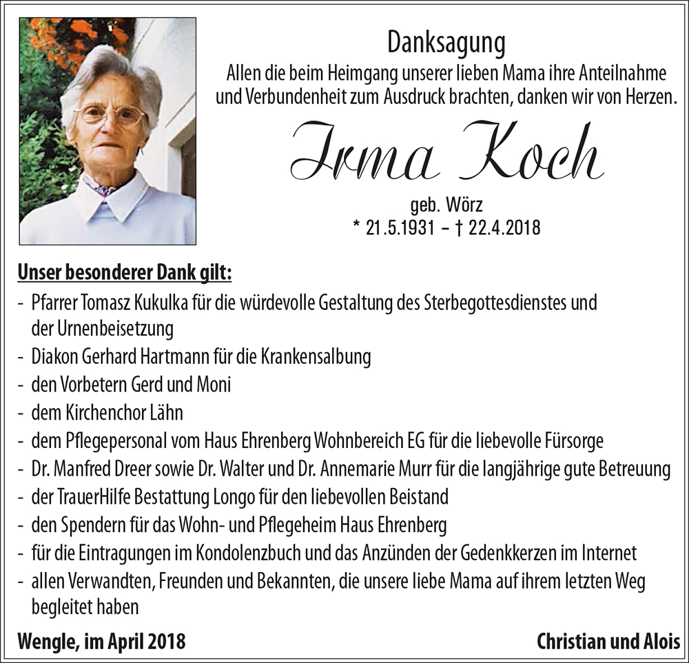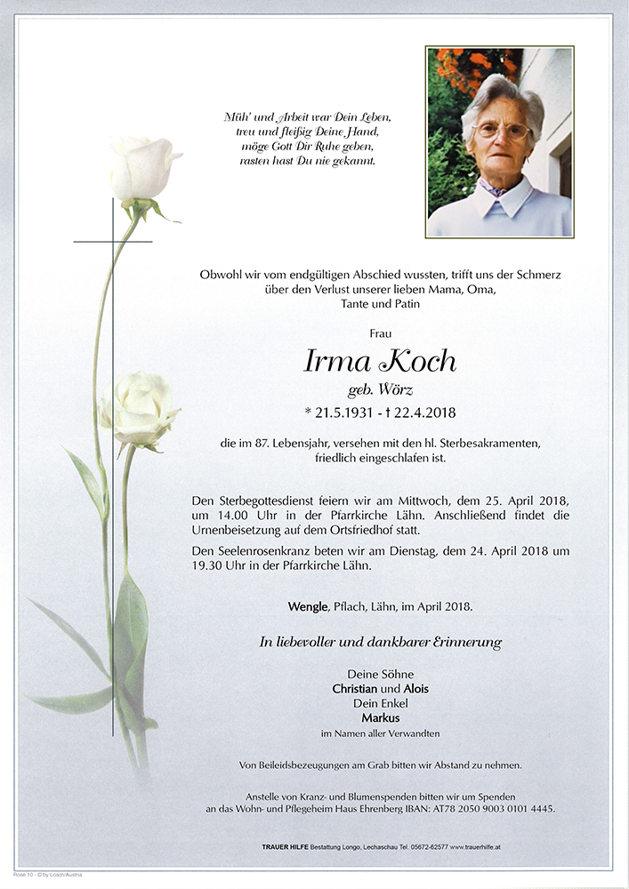 Unser herzlichstes Beileid zum Tod von Irmi.