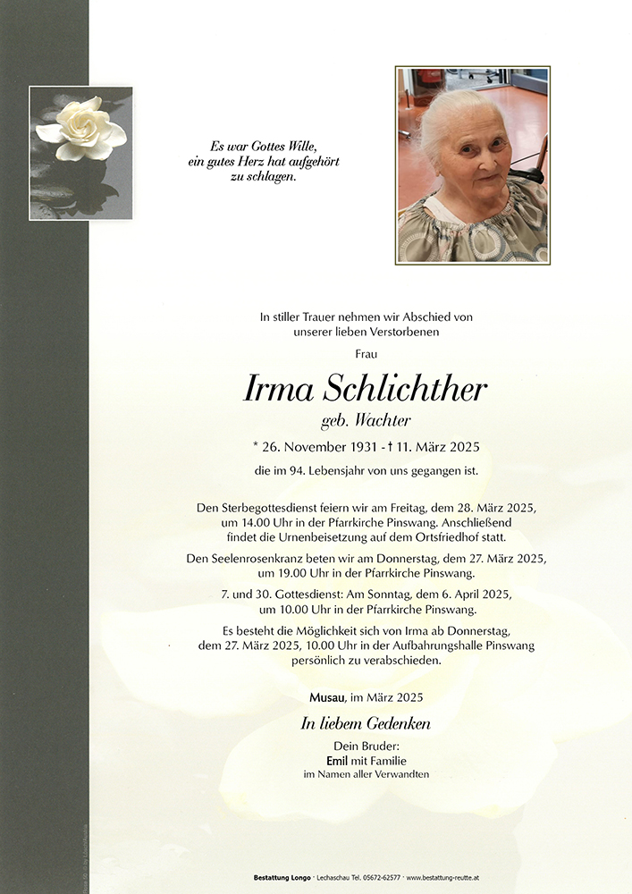 26.11.1931 11.03.2025 Musau Irma Schlichther Action Parte Sterbebild Gedenkkerzen Kondolenzen Parte Sterbebild Gedenkkerzen Kondolenzen Parte herunterladen Sterbebild herunterladen Gedenkkerzen für Irma Schlichther 62 Einträge Kerze anzünden Mathilde & Frank Erich Heiserer Mathilde & Frank Erich Heiserer Mathilde & Frank Fam. Georg Dreer RUHE IN FRIEDEN? Helma Ruhe in Frieden Dagmar Hummel Ruhe in Frieden! Gerda Schlichther Fam. Christian Bader Michael und Petra Wachter Bruno und Gertrud Horndacher Sonja und Pepi Dreer Fam.Vogler Gerhard u. Anita Fam. Erika u. Rudi Petz Helmut & Romana Ostheimer Ein Licht für dich. Margit mit Familie Ruhe in Frieden, Dreer Gitti Ruhe in Frieden Trixi Krainer mit Familie Fam. Engelbert Ostheimer Hermann u. Hannelore Tröber Fam. Paul Kaiser Florian Fischer mit Familie Willi und Elsa Kaiser Dirrhammer Reinhard Familie Anton Specht Doser Joachim + Familie Norbert Beirer Johanna Wörle Elisabeth Doser Alexandra Müller (Schlichther) Ruhe in Frieden, Fam. Franz Haid Irene und Markus Rachbauer Annelies u. Manfred Wachter Magdalena ? Erich Heiserer Hab\'s fein im Himmel ??? Petra und Richard Wörle Reinhold Heiserer deine Nachbarn,Maria u. Günther Roswitha & Walter Rotter Fam. Gassmann Fam. Guggenberger Hans und Doris Ruhe in Frieden Ingrid Dreer mit Familie Ein Licht aus Weißenbach ?️⭐️ Sieghard und Anita Wachter Fam. Tröber Reinhard und Silvia Gabi und Werner Wiesinger Wachter Gitti Theresa Herbert &Margret Schlichther Dominik Heiserer Christian und Isa Wex Schneier Heidi (Jörg) Annelies und Robert Heiserer Fam. Reinhard u. Martina Leuprecht Regensberger Conny und Wolfgang Claudia & Michael Wellenzohn Claudia Schreieck TrauerHilfe Bestattung Longo Ihre Gedenkkerze fürIrma Schlichther Ihr Name* Farbe auswählen Ihre Nachricht oder Name* E-Mail-Adresse* Mit dem Klicken auf "Kerze anzünden" erklären Sie sich mit unseren Datenschutzbestimmungen einverstanden. Kondolenzbuch für Irma Schlichther 0 Einträge Kondolenz verfassen Ihr Abschiedsgruß an Irma Schlichther Ihr Name* E-Mail-Adresse* Ihre Nachricht* Mit dem Klicken auf "Gruß absenden" erklären Sie sich mit unseren Datenschutzbestimmungen einverstanden.