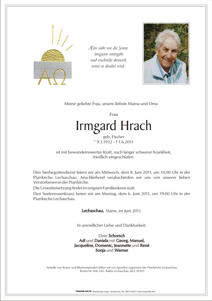 13.12.1901 01.06.2011 Lechaschau Irmgard Hrach Action Parte Sterbebild Gedenkkerzen Kondolenzen Parte Sterbebild Gedenkkerzen Kondolenzen Parte herunterladen Sterbebild herunterladen Gedenkkerzen für Irmgard Hrach 4 Einträge Kerze anzünden wieder Seite an Seite Rita Gruber Ein Kerzenlicht Renate Praxmair Ihre Gedenkkerze fürIrmgard Hrach Ihr Name* Farbe auswählen Ihre Nachricht oder Name* E-Mail-Adresse* Mit dem Klicken auf "Kerze anzünden" erklären Sie sich mit unseren Datenschutzbestimmungen einverstanden. Kondolenzbuch für Irmgard Hrach 0 Einträge Kondolenz verfassen Ihr Abschiedsgruß an Irmgard Hrach Ihr Name* E-Mail-Adresse* Ihre Nachricht* Mit dem Klicken auf "Gruß absenden" erklären Sie sich mit unseren Datenschutzbestimmungen einverstanden.