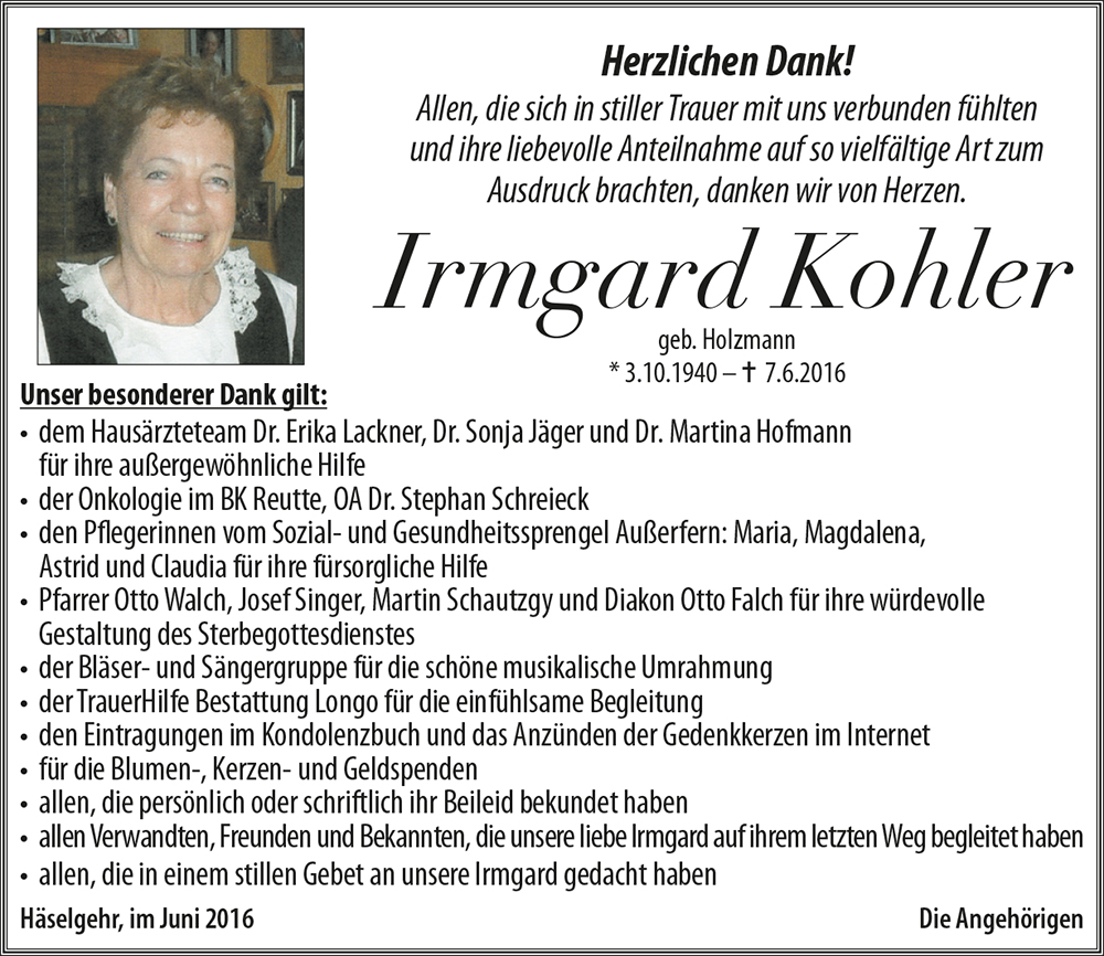 und sprach: Komm heim. Liebe Monika, Werner, Thomas und Michael, wir wünschen euch viel Kraft in dieser traurigen Zeit! Wir werden Irmgard immer in guter Erinnerung behalten!