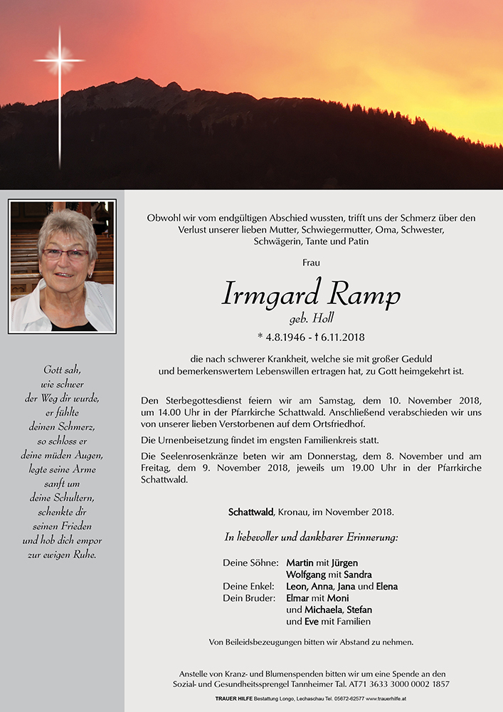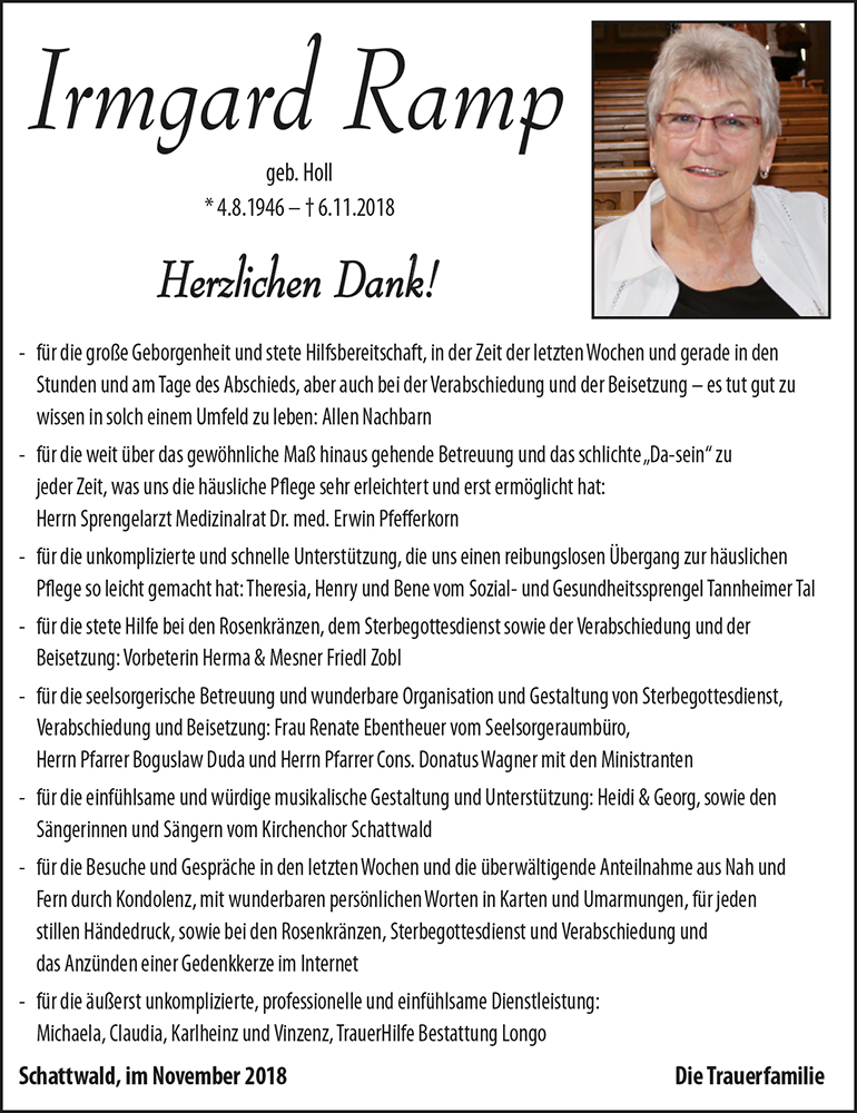 Ihnen liebe Familie Ramp, wünschen wir vom Herzen ganz viel Kraft für die Zeit des großen Schmerzes um den Verlust einer geliebte Mutter, Oma und Schwester.
