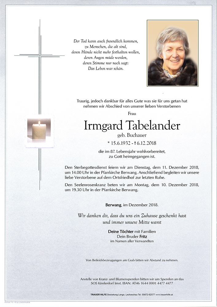 Liebe Tabelanders! Gestern, 5. November 2019, waren mein Mann und ich unterwegs auf dem Weg Richtung Füssen. Als wir die Abzweigung Berwang sahen, wollten wir einen kl. Abstecher Richtung Berwang auf dem Nachhauseweg machen, aber leider war es auf dem Rückweg schon sehr spät. Und so erinnerte ich mich heute zuhause noch einmal zurück an den Dezember 1984, als ich meine erste Arbeitsstelle in Berwang antrat, an die Familie Tabelander mit Gerti, Karin, Nane , den damals 5jährigen Alexander und den süssen kleinen Patti, Patrick von der Karin. „ Umgat“ hat er mich genannt und hatte so gerne Lapi. Und an den besonders netten Papa Hans und an Gitti. Und nach meinen Recherchen sah ich dann, dass eure liebe Mama vor einem Jahr verstorben ist. Nachträglich mein Beileid! Und liebe Grüsse von mir!