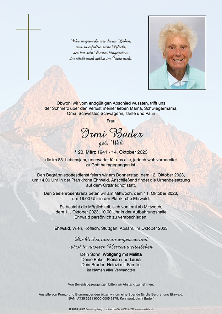 Nun hat der liebe Gott, Irmi erlöst und sie zu sich gerufen. Richard wird sie mit offenen Armen empfangen. Wir werden Irmi als einen liebenswerten Menschen in Erinnerung behalten, die immer so liebevoll über ihre Schwiegertochter Melitta geschwärmt hat.