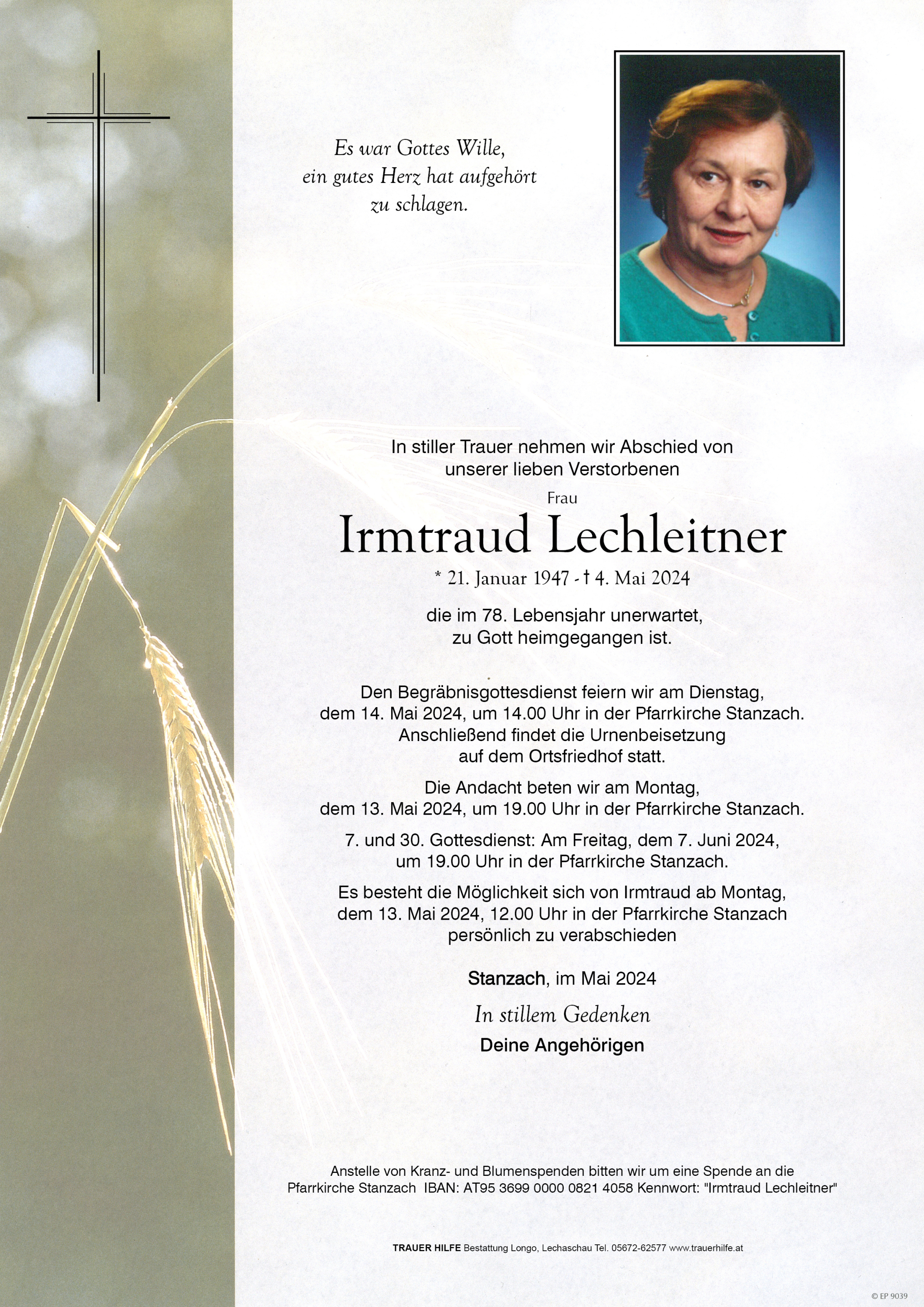 21.01.1947 04.05.2024 Stanzach Irmtraud Lechleitner Action Parte Sterbebild Gedenkkerzen Kondolenzen Parte Sterbebild Gedenkkerzen Kondolenzen Parte herunterladen Sterbebild herunterladen Gedenkkerzen für Irmtraud Lechleitner 97 Einträge Kerze anzünden Winkler Helmut & Christl Sonnweber Helene Weißenbach Zum Jahrtag in stillem Gedenken Licht aus Vorderhornbach In stillem Gedenken Irmgard Licht aus Vorderhornbach Dein Neffe Mario Lechleitner mit Familie Gute Reise - deine ehemalige Kollegin Michi In stillem Gedenken Irmgard Hans Dornacher Gabi & Richard Ginther Ruhe in Frieden Oswald und Herta Lechleitnerz Familie Gapp Martin und Michaela Charly Winkler Hans Dornacher Sabine und Fabian Schmid Claudia und Markus Lechleitner Rosemarie Fam. Maldoner-Jäger Gretl & Walter Moser Ruhe in Frieden Christine & Dietmar Friedle Ruhe in Frieden Jenny und Bernhard Dein Patenkind Dietmar Berger Marga & Peter Berger Fam. Margret & Max Wimmer (Loos) martin wiedemann Fam. Bruno Rudigier Sieglinde Riedmann Hanni Scheiber Marietta und Helmut Fuchs "a Liachtle für di" Manuela Margit und Johann Fasser Ruhe in Frieden Carmen Vorderhornbach Fam. Angelika und Andi Bauer Alois & Margret Köpfle Ruhe in Frieden Monika Ulses Renate Kuen (Ginther) Pfiat di Irmtraud - Helga Cristina & Franz Falger Werner, Edi und Toni aus Häselgehr Ruhe in Frieden Schwägerin Edith mit Familie Familie Anton Specht Stefanie & Stefan m. Leonie Romy & Rafael Familie Erwin und Karin Kathrein Familie Gapp Martin und Michaela Elisabeth Schwarz Annelies Hörting mit Familie Gerald u. Petra Friedle Jürgen und Nicola Friedl mit Kindern Peter und Christine Müller Engelbert und Silvia Schneider Fam. Ernst Zotz Ruhe in Frieden Senioren Häselgehr Oswald und Herta Lechleitnerz Pixner Michael und Natalie Haselsberger Markus Evi und Edmund Falger Ruhe in Frieden Irmtraud ✨ Oktavio und Christine Außerhofer Anni Auẞerhofer Familiel Elisabeth Köck R.I.P. Gustl Ihrenberger Annemarie & Bruno HAUG Lisbeth Gamper Irmgard Friedle Rada und Helmut Friedle Christiane + Hubert Pohler Rada und Helmut Friedle Mario und.Barbara Rief Hans Dornacher Werner u. Karin Kleinhans Ruhe in Frieden Ruhe in Frieden Monika und Fred Fam.Martin und Verena Singer Familie Winkler Helmut &Christl Fam.Irmgard u. Franz Gruber Familie Sonnweber Luis & Helene Weißenbach Herbert & Roswitha Lechleitner Gertrud und Jürgen mit Hannah u. Leander-C. ✨RIP✨ Sonja Wechner (Gapp) Charly Winkler Ruhe in Frieden Manfred und Claudia Fam. Marietta u. Hermann Lechleitner Wilfried Zotz Lydia Falger Ruhe in Frieden Veronika und. Monika Fam. Erich Falger Fam. Monika und Hans-Peter Höfler Claudia Schreieck TrauerHilfe Bestattung Longo Ihre Gedenkkerze fürIrmtraud Lechleitner Ihr Name* Farbe auswählen Ihre Nachricht oder Name* E-Mail-Adresse* Mit dem Klicken auf "Kerze anzünden" erklären Sie sich mit unseren Datenschutzbestimmungen einverstanden. Kondolenzbuch für Irmtraud Lechleitner 0 Einträge Kondolenz verfassen Ihr Abschiedsgruß an Irmtraud Lechleitner Ihr Name* E-Mail-Adresse* Ihre Nachricht* Mit dem Klicken auf "Gruß absenden" erklären Sie sich mit unseren Datenschutzbestimmungen einverstanden.