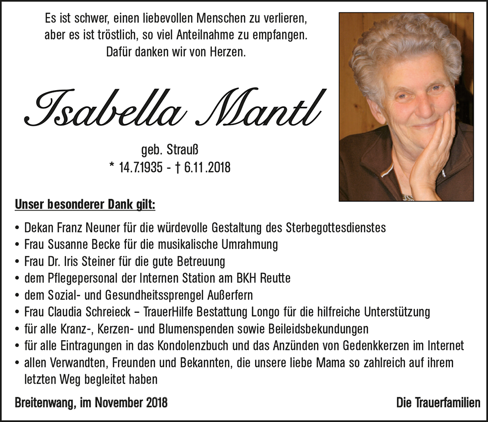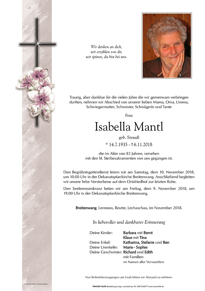 Sie war so eine feine, ruhige Frau. Ich möchte dir gerne sagen, dass meine Mama ihre Cousine Isabella immer sehr geschätzt und von Jugend an gern gehabt hat. Man muss sich nicht oft treffen, um sich verbunden zu fühlen.
