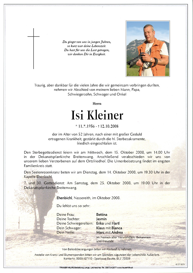 13.12.1901 12.10.2008 Ehenbichl Isi Kleiner Action Parte Gedenkkerzen Kondolenzen Jahrestag Parte Gedenkkerzen Kondolenzen Jahrestag Parte herunterladen Gedenkkerzen für Isi Kleiner 13 Einträge Kerze anzünden Elmar ein ehemaliger Bettnachbar vom LKH Natters Elmar Beirer Wolfgang Schiftner Elmar Beirer Das ewige Licht leuchte Dir Das ewige Licht leuchte Dir Anja u. Franz Ruhe in Frieden Barbara und Markus Das ewige Licht leuchte Dir Knoll Anton Wachter Dietmar Ihre Gedenkkerze fürIsi Kleiner Ihr Name* Farbe auswählen Ihre Nachricht oder Name* E-Mail-Adresse* Mit dem Klicken auf "Kerze anzünden" erklären Sie sich mit unseren Datenschutzbestimmungen einverstanden. Kondolenzbuch für Isi Kleiner 0 Einträge Kondolenz verfassen Ihr Abschiedsgruß an Isi Kleiner Ihr Name* E-Mail-Adresse* Ihre Nachricht* Mit dem Klicken auf "Gruß absenden" erklären Sie sich mit unseren Datenschutzbestimmungen einverstanden. Jahrestag herunterladen