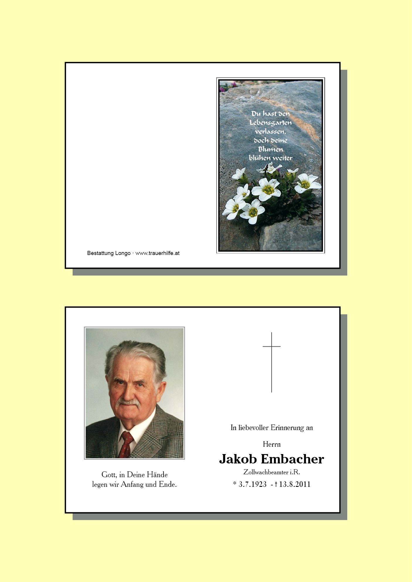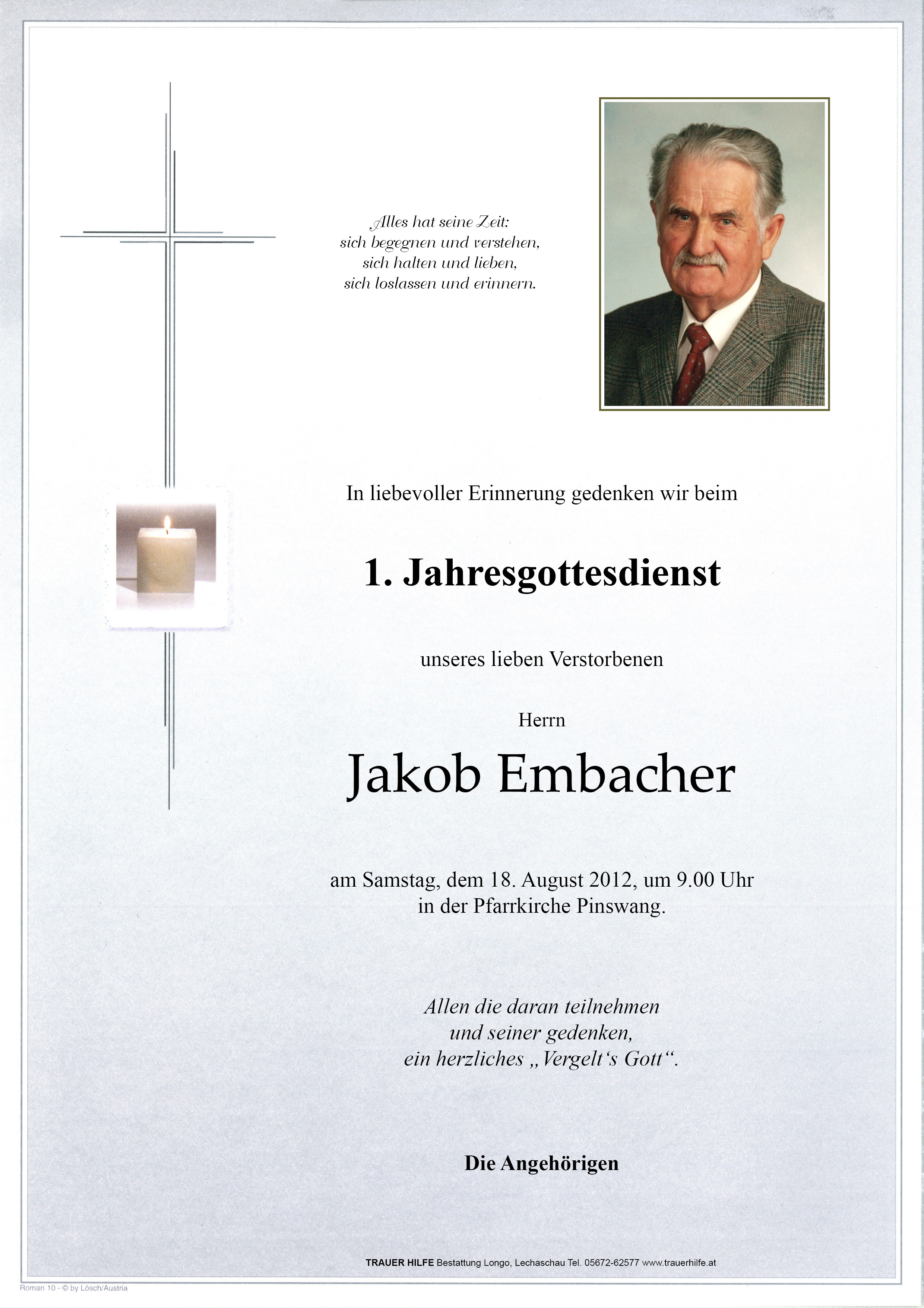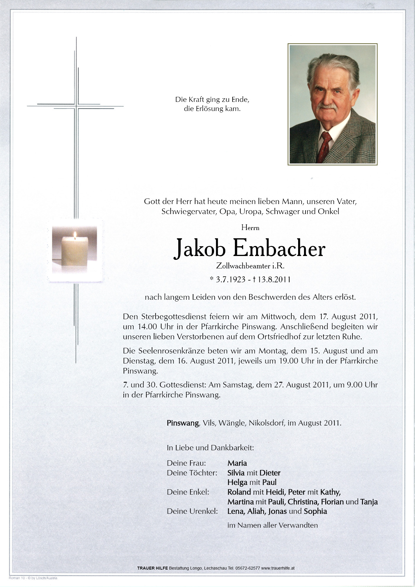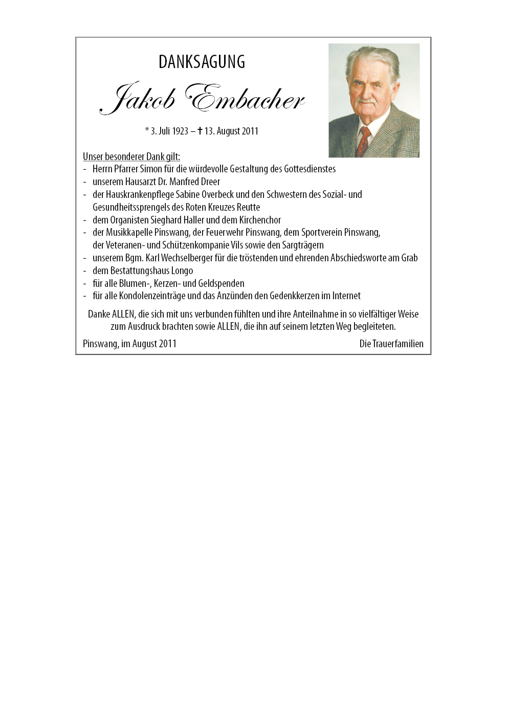 13.12.1901 13.08.2011 Pinswang Jakob Embacher Action Parte Sterbebild Gedenkkerzen Kondolenzen Danksagung Jahrestag Parte Sterbebild Gedenkkerzen Kondolenzen Danksagung Jahrestag Parte herunterladen Sterbebild herunterladen Gedenkkerzen für Jakob Embacher 4 Einträge Kerze anzünden Ein Licht für die Ewigkeit! Ein Licht für die Ewigkeit! Fam. Alfred Oberhollenzer Renate Praxmair Ihre Gedenkkerze fürJakob Embacher Ihr Name* Farbe auswählen Ihre Nachricht oder Name* E-Mail-Adresse* Mit dem Klicken auf "Kerze anzünden" erklären Sie sich mit unseren Datenschutzbestimmungen einverstanden. Kondolenzbuch für Jakob Embacher 0 Einträge Kondolenz verfassen Ihr Abschiedsgruß an Jakob Embacher Ihr Name* E-Mail-Adresse* Ihre Nachricht* Mit dem Klicken auf "Gruß absenden" erklären Sie sich mit unseren Datenschutzbestimmungen einverstanden. Danksagung herunterladen Jahrestag herunterladen