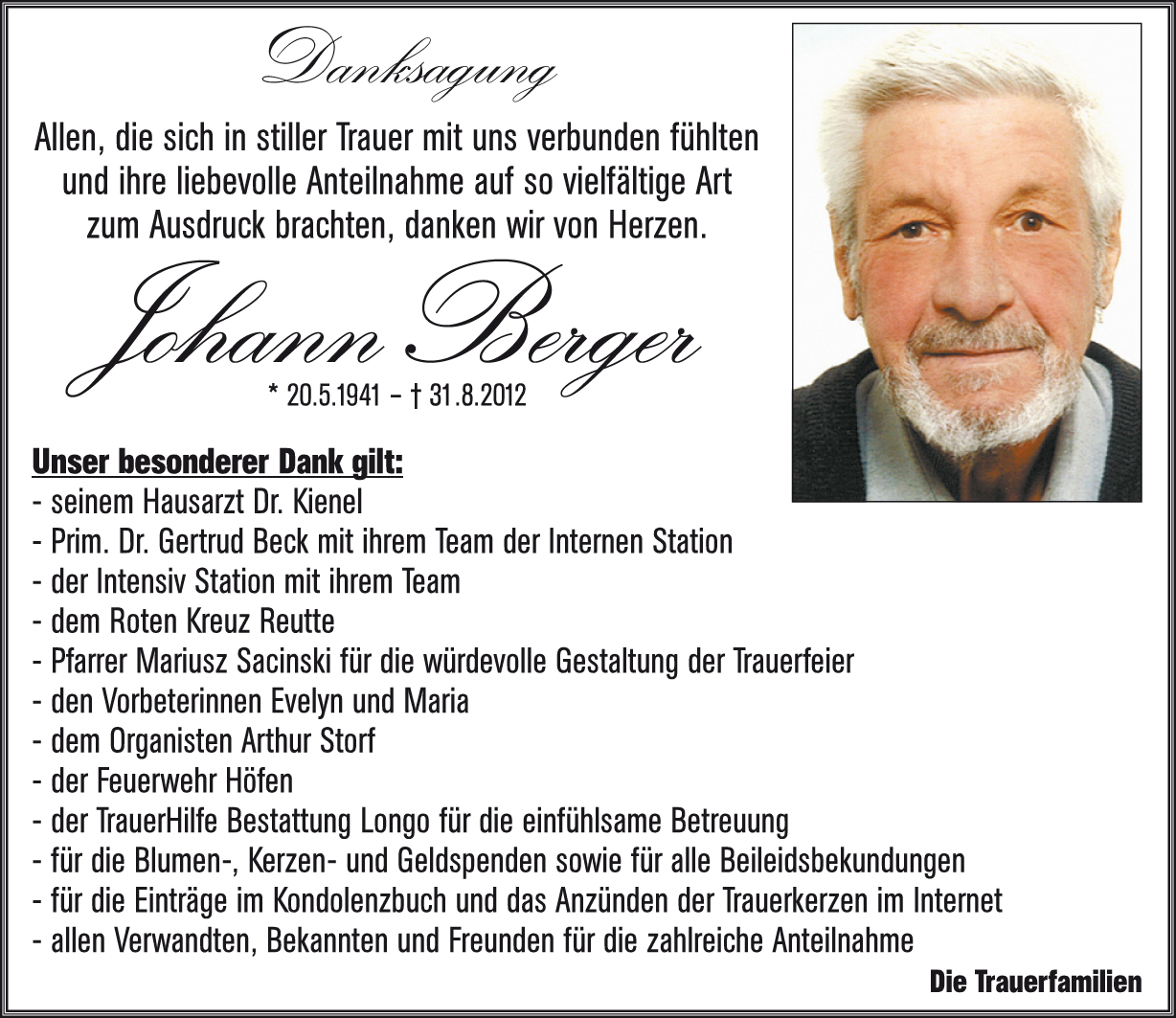 Unser aufrichtiges Beileid der Trauerfamilie Berger.