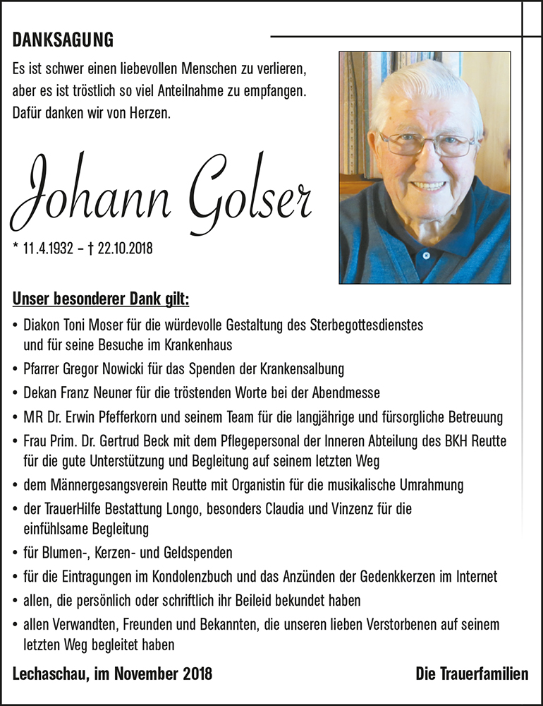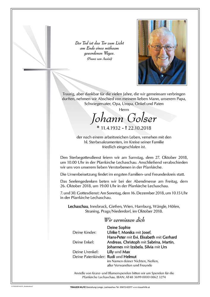 Nun bist Du uns allen den Weg vorausgegangen, den wir längst auch schon beschritten haben. Du warst uns ein Vorbild an Familiensinn, Geduld, Herzlichkeit und erfolgreicher, arbeitsamer Lebensgestaltung. Man musste Dich einfach mögen und Du bleibst in unseren Gedanken.