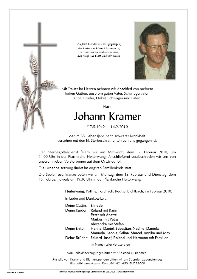 13.12.1901 14.02.2010 Heiterwang Johann Kramer Action Parte Sterbebild Gedenkkerzen Kondolenzen Jahrestag Parte Sterbebild Gedenkkerzen Kondolenzen Jahrestag Parte herunterladen Sterbebild herunterladen Gedenkkerzen für Johann Kramer 30 Einträge Kerze anzünden Elmar Ein Licht für Dich , , , Ruhe in Frieden Unvergessen in unseren Herzen Du fehlst uns! ! ❤️ Du fehlst uns allen sehr ♥️ Fam. Manfred Lageder Ein Licht für Dich a Liacht\\\'l soll dir leuchten. . Peter, Anette, Basti, Nadine u. Wir vermissen Dich lieber Opa dein Lachen fehlt uns. . . a Licht´l für´d Ewigkeit du fehlst uns Opa Basti, Nini und Dani Alexandra, Nassereith Fam. Manfred Lageder Basti Ruhe in Frieden lieber Hans In stillem Gedenken Lieber Opa . . . . du fehlst uns . . . . . Basti, Nadine, Daniela Du fehlst uns. . . Dein Sohn Roland mit Fam. Basti & Nadine & Daniela Peter & Anette Hilda und Martha dein Sohn Roland mit Fam. Dein Sohn Roland mit Familie Ihre Gedenkkerze fürJohann Kramer Ihr Name* Farbe auswählen Ihre Nachricht oder Name* E-Mail-Adresse* Mit dem Klicken auf "Kerze anzünden" erklären Sie sich mit unseren Datenschutzbestimmungen einverstanden. Kondolenzbuch für Johann Kramer 1 Eintrag Kondolenz verfassen Egal wie oft i an die denk eigal wie oft i trauern um die du hättesch da bleiben soll! Max Fröhlich 23.02.2013 um 03:29 Uhr Ihr Abschiedsgruß an Johann Kramer Ihr Name* E-Mail-Adresse* Ihre Nachricht* Mit dem Klicken auf "Gruß absenden" erklären Sie sich mit unseren Datenschutzbestimmungen einverstanden. Jahrestag herunterladen