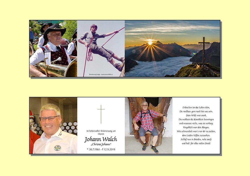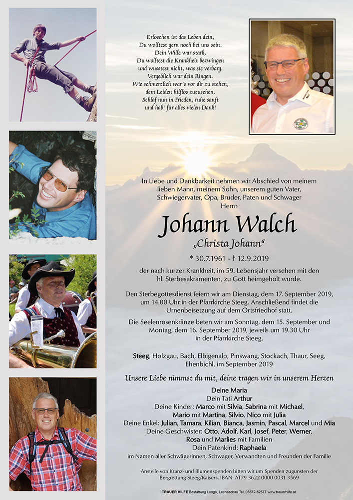 Zutiefst erschüttert und traurig über das Ableben unseres Freundes und Bergkameraden Johann, zugleich aber hoffnungsvoll in die Zukunft blickend, dass ihm alles, was er für uns und unseren Verein getan und gegeben hat, Gott im Himmel vergelten möge, nehmen wir Abschied und wünschen
