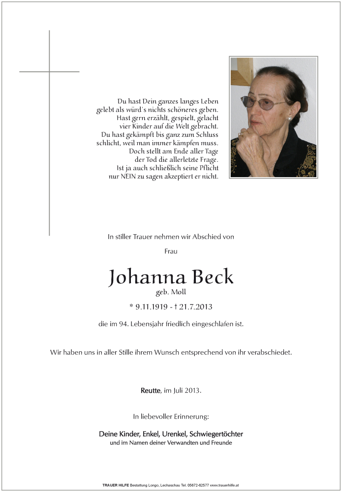 09.11.1919 21.07.2013 Reutte Johanna Beck Action Parte Gedenkkerzen Kondolenzen Parte Gedenkkerzen Kondolenzen Parte herunterladen Gedenkkerzen für Johanna Beck 47 Einträge Kerze anzünden . . . gute Reise. . . Petschnig Elisabeth wowo mit familie Familie Eva Hiebl Erika Andreas Wiesenegg mit Familie Julia und Ritschi Ernst Reichel Fam. Otto und Ilse Lorenz Marion Höller mit Kinder Brunnsteiner Helga Josef und Walburga Dürrhammer Christine Grasl in stillen gedenken Petra & Hubert Schmid Andreas Melekusch Jenny strobl Chrstine Keller Sigi u. Anni Höfler mit Fam Fam. Franz u. Annelies Angerer Familie Manfred Gutmann Ein Licht für dich Stiller Gruß Sonja Fam. Wagner-Stöger sepp u gitti schöffmann Ruhe in Frieden! Sigi Helmer Sarah Friedle Ruhe in Frieden HelgaSinger Fam. Van Den Heede-Leuprecht Margit Dablander Rita Gruber Gerd & Trixi Reisigl Fam. Dr. Tschiderer Fam. Günther Ihrenberger Elke Wolf Fam. Glätzle Edi Marika Huber Maria Lutz & Sonja Babsi und Heinz Saletz, Rieden Gretl Böhm, Rieden Monika und Gustl Ihrenberger Katrin Huber & Wolfgang Trs Traudi u. Sepp Wolf Fam. Kößler Werner u. Karin Edith Herb Gerda und Fritz Bubendorfer Maria Beyrer Ihre Gedenkkerze fürJohanna Beck Ihr Name* Farbe auswählen Ihre Nachricht oder Name* E-Mail-Adresse* Mit dem Klicken auf "Kerze anzünden" erklären Sie sich mit unseren Datenschutzbestimmungen einverstanden. Kondolenzbuch für Johanna Beck 0 Einträge Kondolenz verfassen Ihr Abschiedsgruß an Johanna Beck Ihr Name* E-Mail-Adresse* Ihre Nachricht* Mit dem Klicken auf "Gruß absenden" erklären Sie sich mit unseren Datenschutzbestimmungen einverstanden.