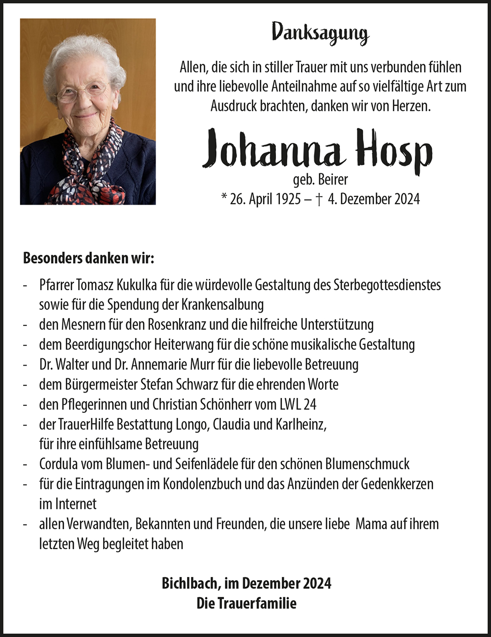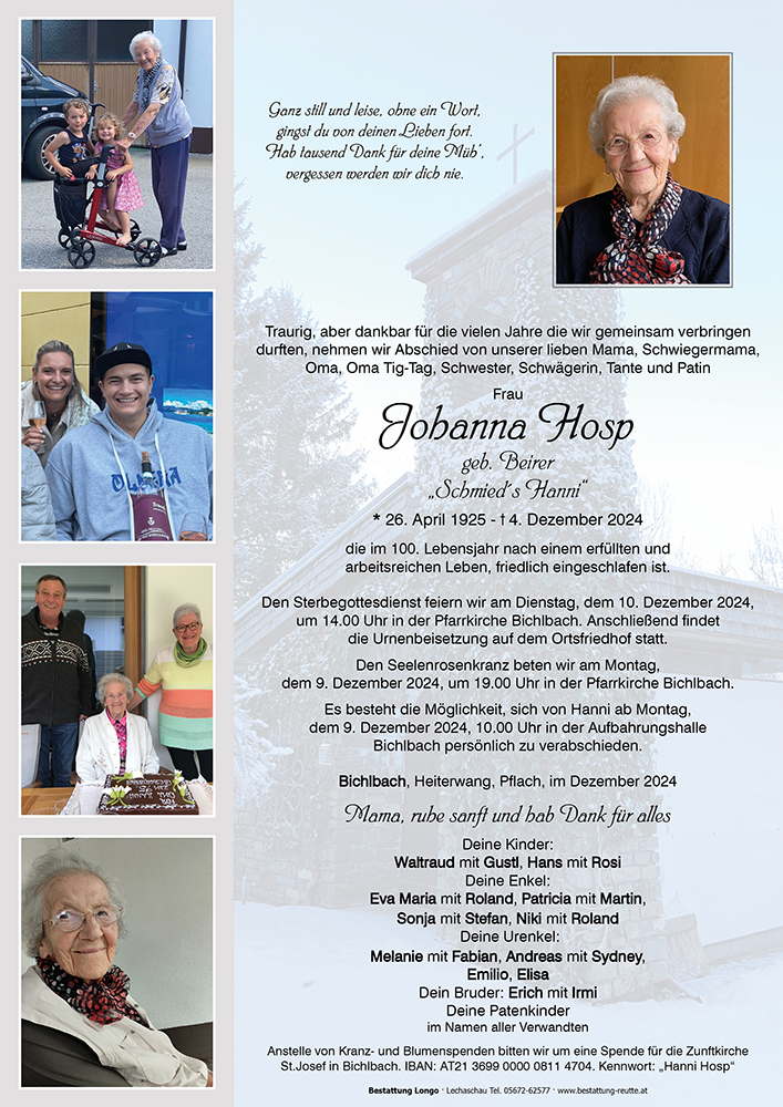 eure liebe Mama/Schwiegermama und Oma durfte nach einem erfüllten Leben das 100. Lebensjahr erreichen und ging friedlich von der sichtbaren in eine unsichtbare Welt. In euren Herzen lebt sie spürbar weiter. Gebt eurer Trauer Zeit und Raum und erinnert euch an die vielen schönen, gemeinsamen Jahre. Uns bleibt „Schmieds Hanni“ als ein ganz besonderer Mensch in Erinnerung. Unvergessen die Begegnungen und wertvollen Gespräche mit ihr, besonders bei den Zunftfeiern und Bruderschaftsversammlungen. Als Gattin des damaligen Bürgermeisters Arthur Hosp war sie ab 1969 ständig mit der Renovierung und Erhaltung der einzigen Zunftkirche Österreichs konfrontiert. Aus der Werkstätte des Gatten und Schmiedemeisters Arthur Hosp stammt auch der untere Teil des Abschlussgitters in der Zunftkirche. Am 12. Oktober 1974 erhielt die Gemeinde Bichlbach ein eigenes Gemeindewappen und „Hanni“ stiftete der Gemeinde eine Fahne mit dem neuen Gemeindewappen. „Hanni“ war eine treue Wegbegleiterin und Förderin der Zunftkirche und der Bichlbacher Handwerksbruderschaft.