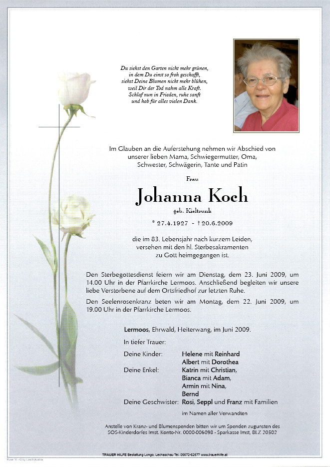 13.12.1901 20.06.2009 Lermoos Johanna Koch Action Parte Gedenkkerzen Kondolenzen Parte Gedenkkerzen Kondolenzen Parte herunterladen Gedenkkerzen für Johanna Koch 85 Einträge Kerze anzünden Alles Gute zum Hochzeitstag Daumen halten bitte für Oma und Opa i denk an enk zum Jahrtag Danke wieder Daumen drücken Osterkerze für dich i denk an enk Hab euch lieb Danke Daumen drücken Kuss Neujahrskerze für dich Ruhe in Frieden Schönen Hochzeitstag u. 1. Advent helfts mit bitte Daumen drücken schick mir Gelassenheit i druck di Herbst wirds der erste Schnee fällt Wir freuen uns sehr! Ruhe in Frieden zum Jahrtag deine Ruhe bräuchte ich In Stillem Gedenken Ruhe in Frieden hab in Erinnerungen geschwelgt Alles Gute zum Geburtstag danke Hab euch lieb i druck enk ganz fest Weihnachtslicht für dich gratuliere zum 5. Enkelkind wir genießen die schöne Zeit morgen wieder Daumen halten unvergessen seids für ins in eurem Haus a Baby a nuis Urenkele :-)) für enk danke Daumen drücken danke für den schönen Tag gestern danke dass ihr da seid Alle Gute zum Geburtstag Opa bauts ihn auf schickts uns Kraft macht was ihr könnt weiter zsamm auf das richtige Ergebnis hoffen heute zählt\'s alles Gute zum Hochzeitstag danke für das Zeichen weiter Daumen drücken helfts boade mit pass mit auf aufn Papa bitte bei jedem Bergfeuer denk i an di Zum Jahrtag im Traum war ich bei euch alles Gute zum Hochzeitstag habts tanzt auf Bernds Hochzeit du wirst vermisst zum Geburtstag schick mir deine Geduld ich drück euch ganz fest So ein schönes Geschenk danke Zum Geburtstag lg Linus Zum Geburtstag Zum Hochzeitstag :-) uns gehts gut Danke K + C + . . . Katrin Frohe Weihnachten hab von dir geträumt so schön denkts an ins unserer Oma danke fürs Daumen drücken in memoriam :-) danke :-) Bernd besonders morgen fehlt ihr Hab grad an euch gedacht Katrin & Christian Ihre Gedenkkerze fürJohanna Koch Ihr Name* Farbe auswählen Ihre Nachricht oder Name* E-Mail-Adresse* Mit dem Klicken auf "Kerze anzünden" erklären Sie sich mit unseren Datenschutzbestimmungen einverstanden. Kondolenzbuch für Johanna Koch 1 Eintrag Kondolenz verfassen Ich hab euch ganz fest lieb und vermisse euch sehr. Trotzdem spürt man immer wieder dass ihr da seid und über uns wacht. wie schön. Besucht mich mal wieder in meinen Träumen Katrin 02.08.2024 um 19:03 Uhr Ihr Abschiedsgruß an Johanna Koch Ihr Name* E-Mail-Adresse* Ihre Nachricht* Mit dem Klicken auf "Gruß absenden" erklären Sie sich mit unseren Datenschutzbestimmungen einverstanden.