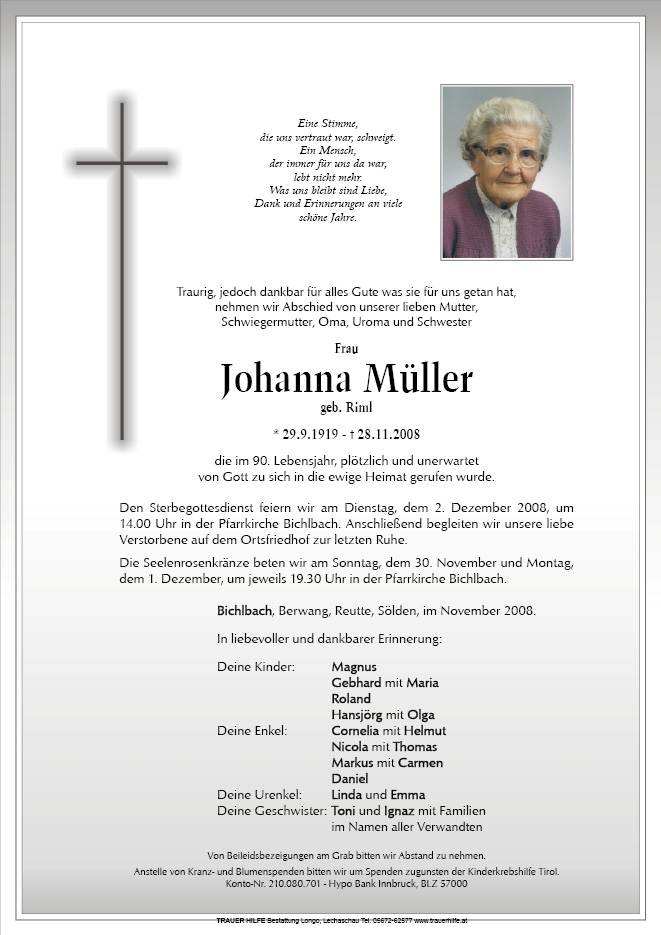 13.12.1901 28.11.2008 Bichlbach Johanna Müller Action Parte Gedenkkerzen Kondolenzen Parte Gedenkkerzen Kondolenzen Parte herunterladen Gedenkkerzen für Johanna Müller 2 Einträge Kerze anzünden Ruhe sanft in Gottes Hand! Ruhe in Frieden! Ihre Gedenkkerze fürJohanna Müller Ihr Name* Farbe auswählen Ihre Nachricht oder Name* E-Mail-Adresse* Mit dem Klicken auf "Kerze anzünden" erklären Sie sich mit unseren Datenschutzbestimmungen einverstanden. Kondolenzbuch für Johanna Müller 0 Einträge Kondolenz verfassen Ihr Abschiedsgruß an Johanna Müller Ihr Name* E-Mail-Adresse* Ihre Nachricht* Mit dem Klicken auf "Gruß absenden" erklären Sie sich mit unseren Datenschutzbestimmungen einverstanden.