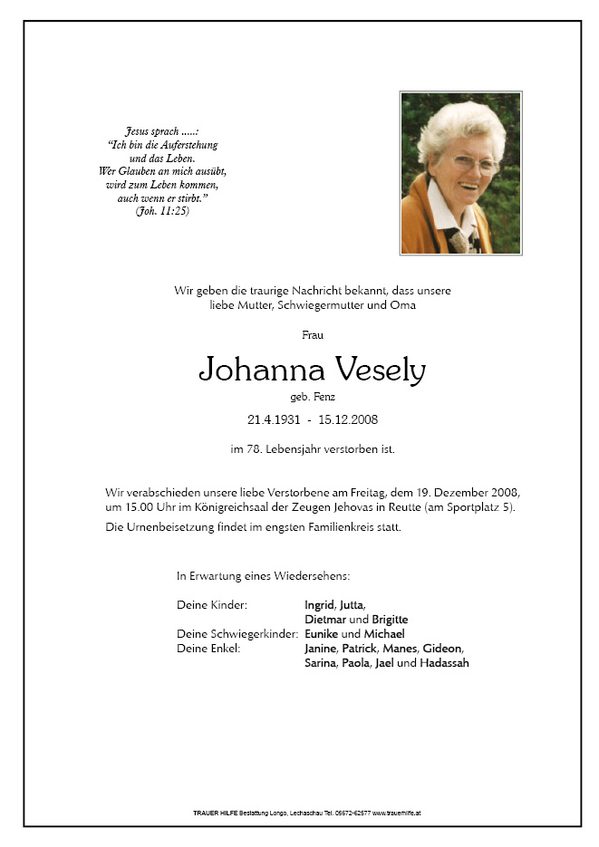13.12.1901 15.12.2008 Axams Johanna Vesely Action Parte Gedenkkerzen Kondolenzen Parte Gedenkkerzen Kondolenzen Parte herunterladen Gedenkkerzen für Johanna Vesely 0 Einträge Kerze anzünden Ihre Gedenkkerze fürJohanna Vesely Ihr Name* Farbe auswählen Ihre Nachricht oder Name* E-Mail-Adresse* Mit dem Klicken auf "Kerze anzünden" erklären Sie sich mit unseren Datenschutzbestimmungen einverstanden. Kondolenzbuch für Johanna Vesely 0 Einträge Kondolenz verfassen Ihr Abschiedsgruß an Johanna Vesely Ihr Name* E-Mail-Adresse* Ihre Nachricht* Mit dem Klicken auf "Gruß absenden" erklären Sie sich mit unseren Datenschutzbestimmungen einverstanden.