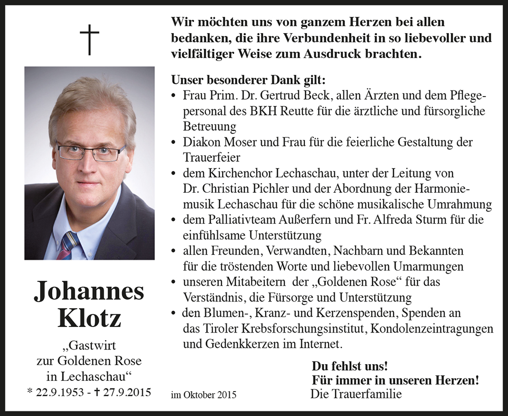 Mit Dir Hannes haben wir einen Freund und Gönner verloren. Wir werden Dir stets ein ehrendes Andenken bewahren. Unsere Anteilnahme gilt den Angehörigen. Für den Tischtennisverein Lechaschau Werner Kuehs