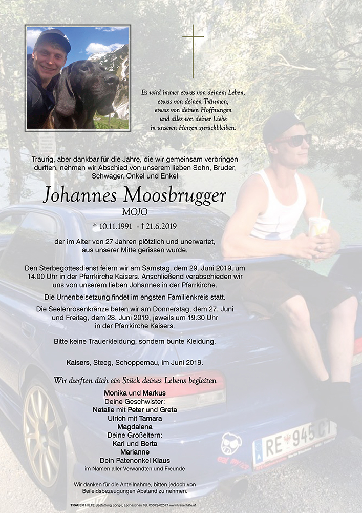 Kondolenzbuch für Johannes Moosbrugger