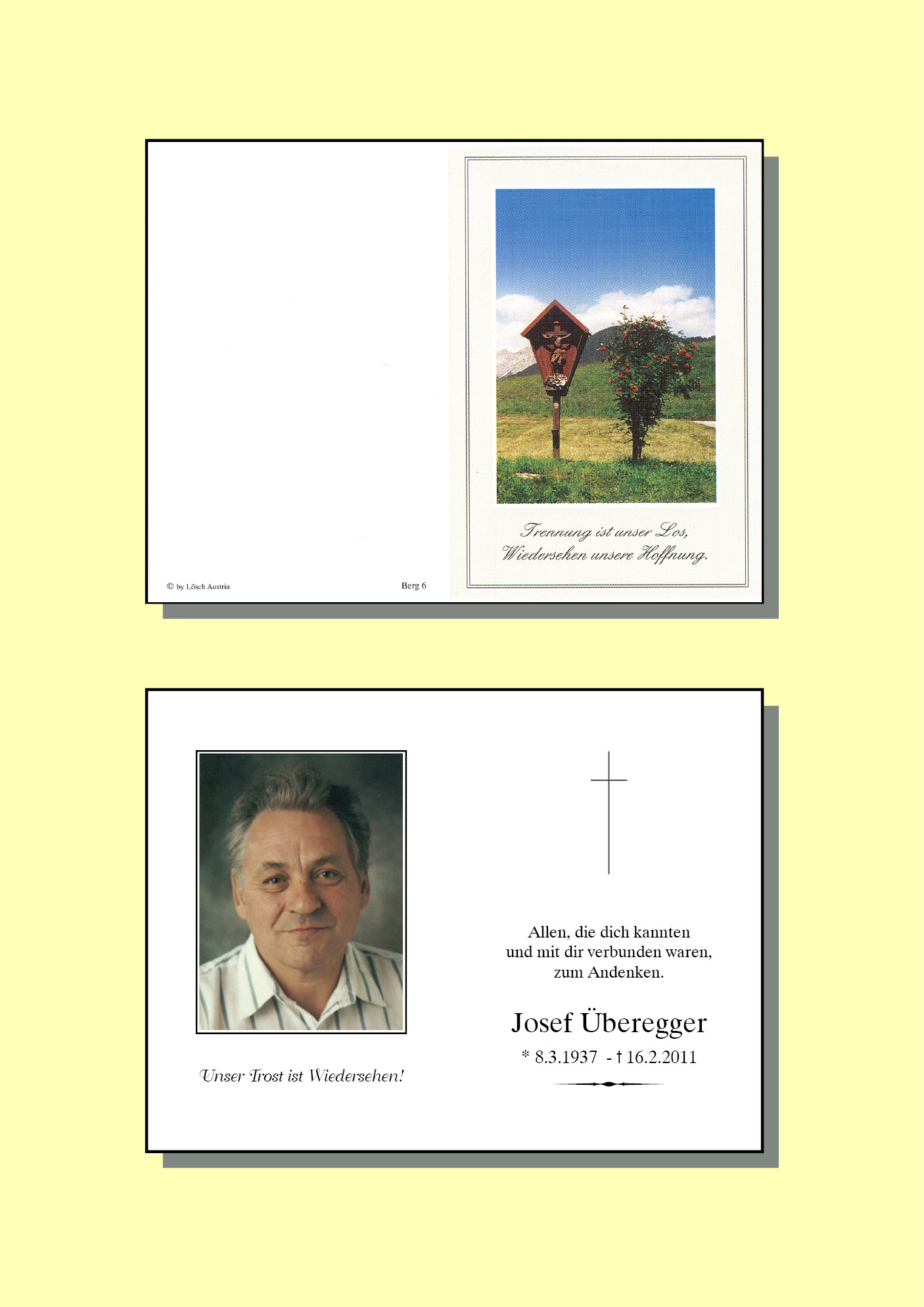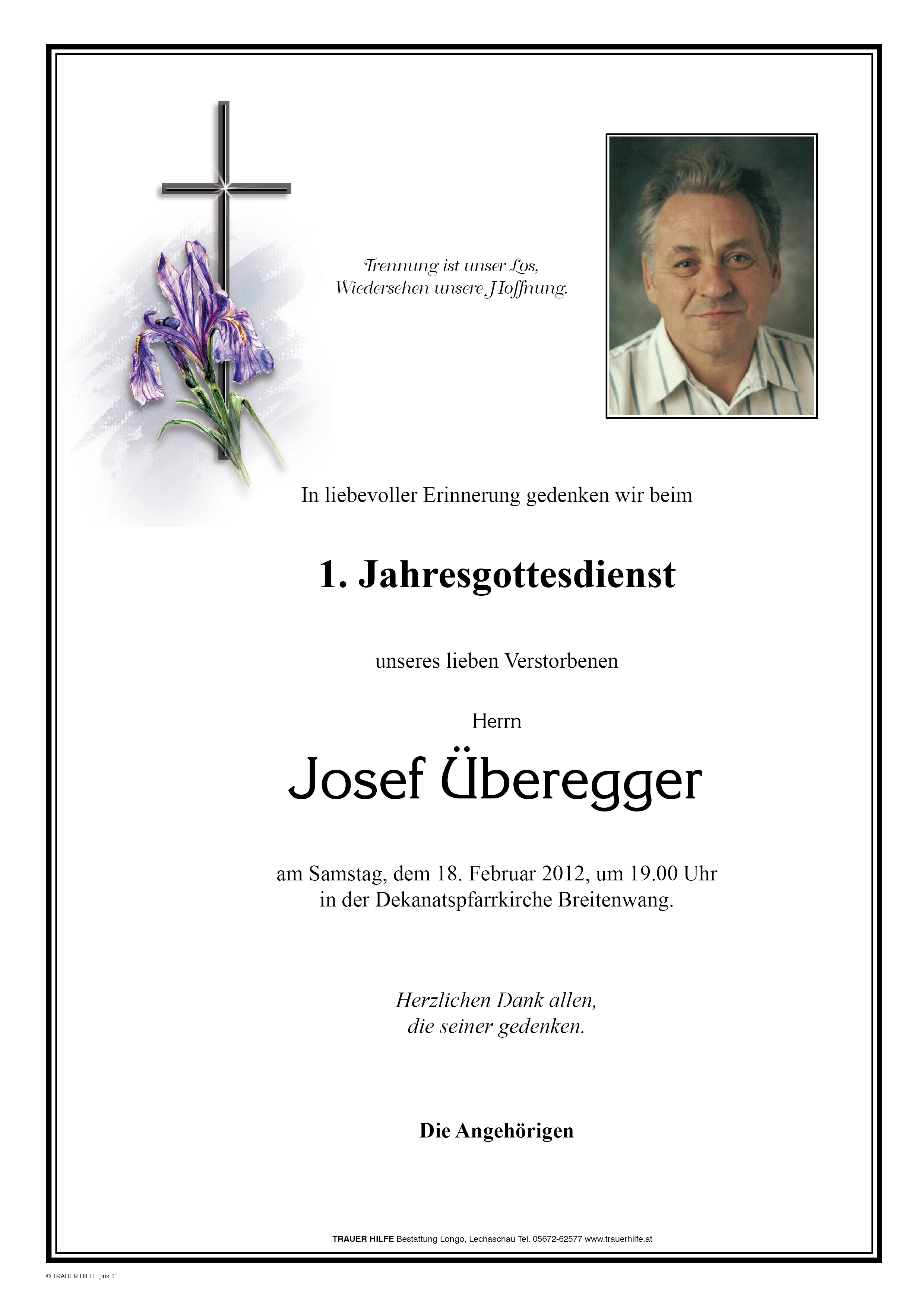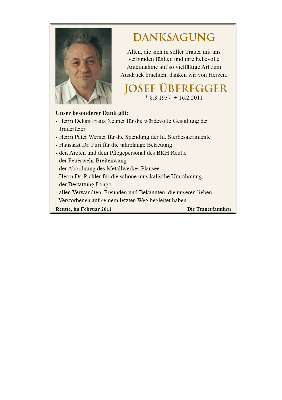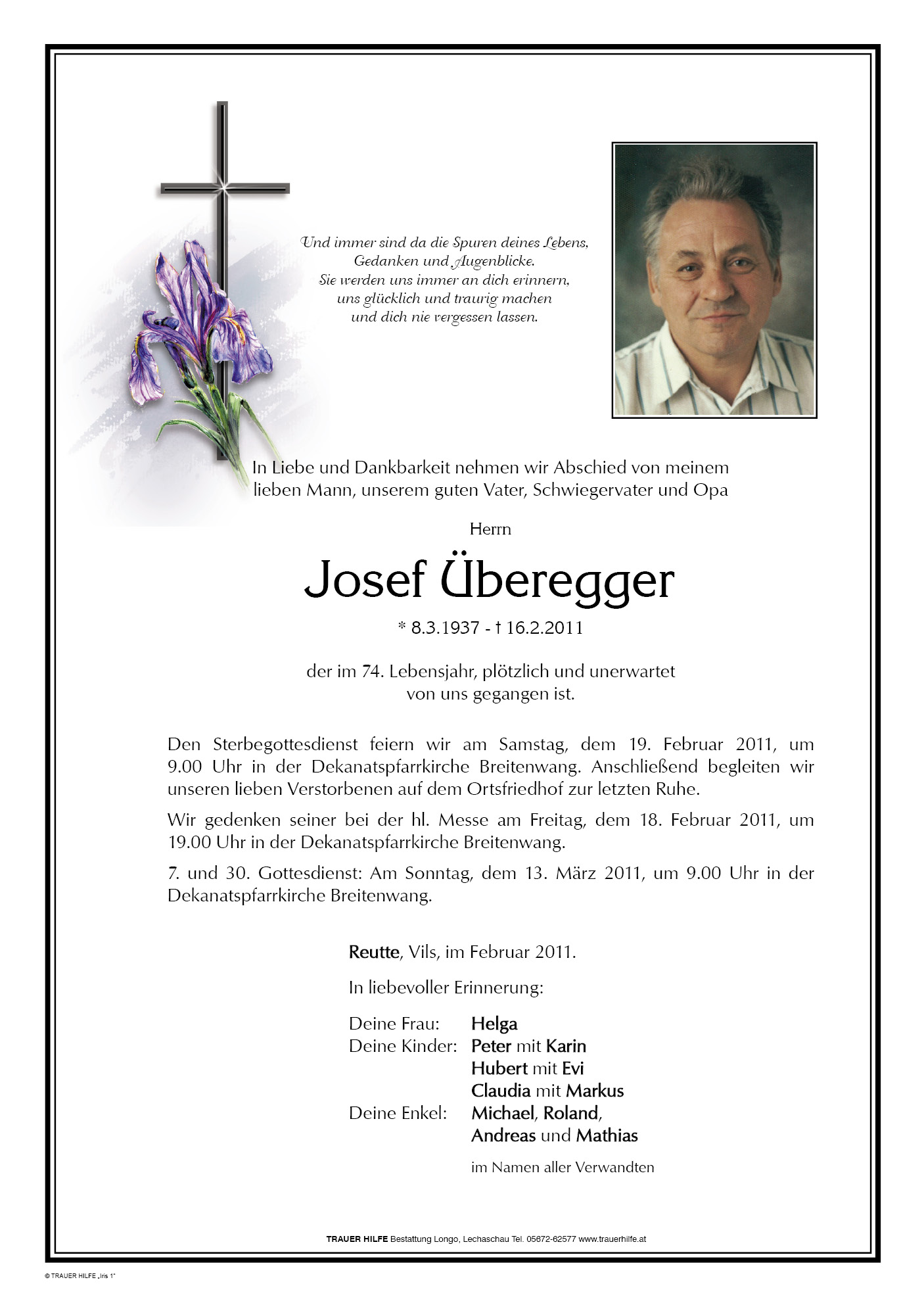 13.12.1901 16.02.2011 Reutte Josef Überegger Action Parte Sterbebild Gedenkkerzen Kondolenzen Danksagung Jahrestag Parte Sterbebild Gedenkkerzen Kondolenzen Danksagung Jahrestag Parte herunterladen Sterbebild herunterladen Gedenkkerzen für Josef Überegger 4 Einträge Kerze anzünden Lisi, Thomas und Otto Lisi, Thomas und Otto Sonja Kuisle Fam. Kößler Werner Ihre Gedenkkerze fürJosef Überegger Ihr Name* Farbe auswählen Ihre Nachricht oder Name* E-Mail-Adresse* Mit dem Klicken auf "Kerze anzünden" erklären Sie sich mit unseren Datenschutzbestimmungen einverstanden. Kondolenzbuch für Josef Überegger 0 Einträge Kondolenz verfassen Ihr Abschiedsgruß an Josef Überegger Ihr Name* E-Mail-Adresse* Ihre Nachricht* Mit dem Klicken auf "Gruß absenden" erklären Sie sich mit unseren Datenschutzbestimmungen einverstanden. Danksagung herunterladen Jahrestag herunterladen