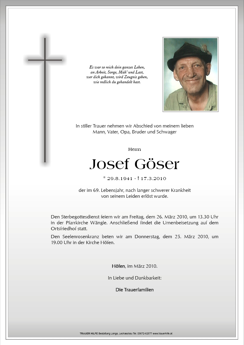 13.12.1901 17.03.2010 Höfen Josef Göser Action Parte Sterbebild Gedenkkerzen Kondolenzen Parte Sterbebild Gedenkkerzen Kondolenzen Parte herunterladen Sterbebild herunterladen Gedenkkerzen für Josef Göser 0 Einträge Kerze anzünden Ihre Gedenkkerze fürJosef Göser Ihr Name* Farbe auswählen Ihre Nachricht oder Name* E-Mail-Adresse* Mit dem Klicken auf "Kerze anzünden" erklären Sie sich mit unseren Datenschutzbestimmungen einverstanden. Kondolenzbuch für Josef Göser 0 Einträge Kondolenz verfassen Ihr Abschiedsgruß an Josef Göser Ihr Name* E-Mail-Adresse* Ihre Nachricht* Mit dem Klicken auf "Gruß absenden" erklären Sie sich mit unseren Datenschutzbestimmungen einverstanden.