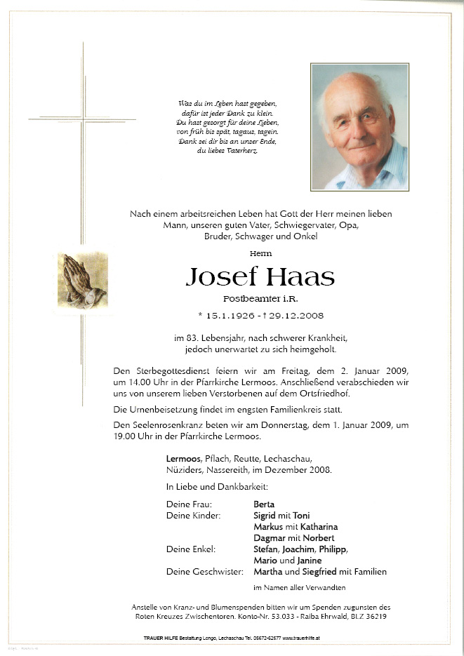 13.12.1901 29.12.2008 Lermoos Josef Haas Action Parte Gedenkkerzen Kondolenzen Parte Gedenkkerzen Kondolenzen Parte herunterladen Gedenkkerzen für Josef Haas 18 Einträge Kerze anzünden Weihnachtslicht und Neujahrslicht für dich Osterkerze Neujahrskerze für dich Im stillen Gedenken Im stillen Gedenken Geborgenheit im Himmel Ruhe in Frieden Weihnachtslicht für dich Ruhe in Frieden RIP RIP Weihnachtslicht Osterkerze A Liachtl für di A Liachtl für di A Liachtl für di Gerd In Erinnerung Ihre Gedenkkerze fürJosef Haas Ihr Name* Farbe auswählen Ihre Nachricht oder Name* E-Mail-Adresse* Mit dem Klicken auf "Kerze anzünden" erklären Sie sich mit unseren Datenschutzbestimmungen einverstanden. Kondolenzbuch für Josef Haas 0 Einträge Kondolenz verfassen Ihr Abschiedsgruß an Josef Haas Ihr Name* E-Mail-Adresse* Ihre Nachricht* Mit dem Klicken auf "Gruß absenden" erklären Sie sich mit unseren Datenschutzbestimmungen einverstanden.