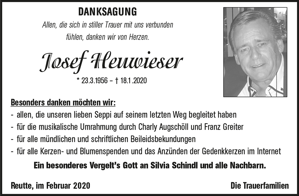 Liebe Trauerfamilien und ... Lieber SEPPI ... R.I.P. - Du warst schon in der Schule + spaeter als EX-Arbeitskollege in der RTW. (BH.) immer lustig + nett drauf. Arme Mama - sie verlor jetzt viel zu frueh auch noch ihren 2.Sohn. Er ging mit mir und Charly in dieselbe Klasse, spielte Trompete in seiner Band und frueher auch bei der Buergermusik Reutte ... warst immer einer der Guten + Netten + leider musstest Du viel zu frueh von uns gehen. DANKE fuer Deine Verbundenheit !!! ... wuensche Dir sorgenfreie + schoene Zeiten in Deiner jetzt neuen Welt !!! ... weiss noch ganz genau, wie stolz zu seinerzeit auf Deine 1. rauchende Maschine warst, auf der ich auch einmal mitfahren durfte ... Grossen DANK auch an Charly fuer sein musikalisches Abschieds-Solo!!! ...