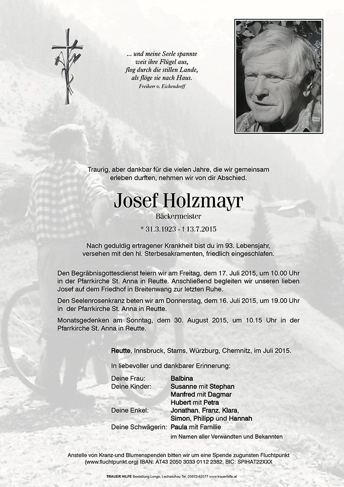 Möge das Vertrauen darauf, dass euer lieber Josef Ruhe und Geborgenheit finden wird im Licht und in der Herrlichkeit Gottes, wo es kein Leid, keinen Schmerz und keine Traurigkeit mehr gibt, euch Trost und Kraft spenden in dieser schweren Zeit des Abschiednehmens des Loslassens und der Trauer!