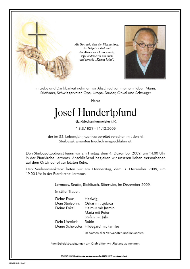 13.12.1901 01.12.2009 Lermoos Josef Hundertpfund Action Parte Gedenkkerzen Kondolenzen Parte Gedenkkerzen Kondolenzen Parte herunterladen Gedenkkerzen für Josef Hundertpfund 20 Einträge Kerze anzünden Osterkerze für dich Neujahrskerze für dich Ruhe in Frieden Im stillen Gedenken Ruhe in Frieden Ruhe in Frieden Neujahrskerze für dich Weihnachtslicht für dich Im stillen Gedenken Ruhe in Frieden Ein Osterlicht für dich Im stillen Gedenken Weihnachtslicht Im stillen Gedenken Osterkerze Für unseren Opa A Liachtl für di A Liachtl für di Für unseren lieben Opa Alfred & Sonja Haas Ihre Gedenkkerze fürJosef Hundertpfund Ihr Name* Farbe auswählen Ihre Nachricht oder Name* E-Mail-Adresse* Mit dem Klicken auf "Kerze anzünden" erklären Sie sich mit unseren Datenschutzbestimmungen einverstanden. Kondolenzbuch für Josef Hundertpfund 0 Einträge Kondolenz verfassen Ihr Abschiedsgruß an Josef Hundertpfund Ihr Name* E-Mail-Adresse* Ihre Nachricht* Mit dem Klicken auf "Gruß absenden" erklären Sie sich mit unseren Datenschutzbestimmungen einverstanden.